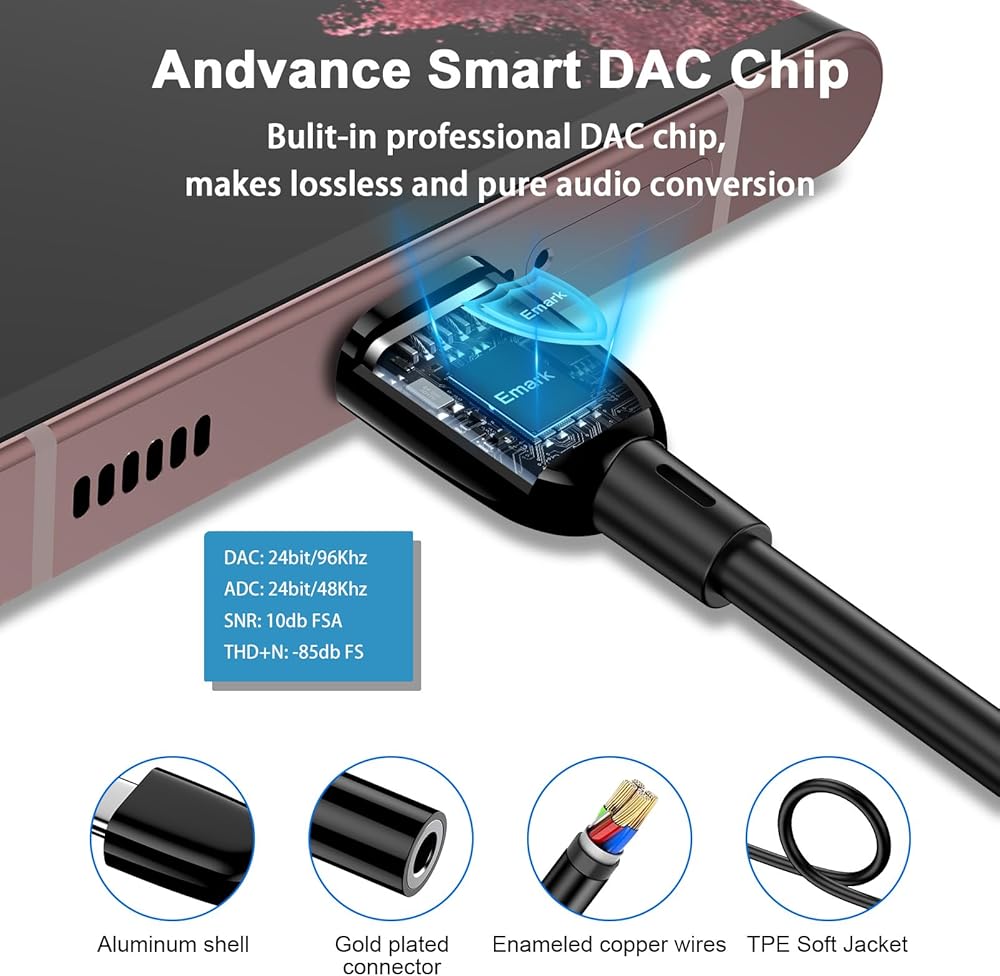 【Hi-Fi Sound Quality Certified】: USB c to 3.5mm samsung s24 heaphone adapter features a Smart DAC chip. Low power consumption, excellent and stable decoding performance, and maximum support for 24Bit/96Khz, 24Bit/48Khz audio sampling rate. Ensure complete and securely connect with your usb c devices.