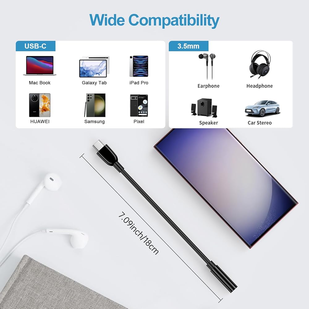 【Compatibility】: The usb c to 3.5mm aux audio adapter compatible with most of the type c devices including phones, tablets, and laptops. iPhone 15 Pro Max,15 Plus,15 Pro,15; Samsung Galaxy S24 Ultra S24+ S24 A15 5G, A55 A35 A25 A14 A13 A54 A34 A53 S23 S23+ S23 Ultra,S21 FE,Z Fold 4 3,Z Flip 4 3,A52 A32 A12,S22 S22+ S22 Ultra 5G,S21+ 5G,S21 S20; Google Pixel 8 Pro 8,7,7 Pro,6,6 Pro,5a 5G,5a,5,4a 5G,4a,4,3a XL;iPad Pro 2021/2020/2018, iPad Air 2020, iPad mini 6 2021; and more.