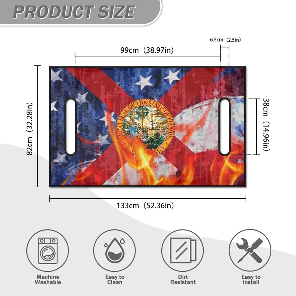 Universal Size: Our golf cart seat cover total length design measured at 50L x 30.9W inches (blanket size). The length between the two holes is 38.5 inches, and the width of the handrail hole is 13.9 inches. This golf cart seat cover is universal for Club Car and more 2-seat golf carts and can be use it for a long time.