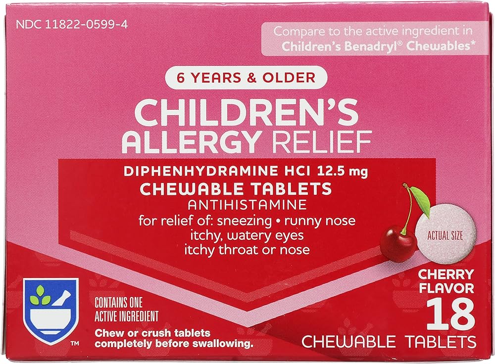 CONTROL INDOOR & OUTDOOR ALLERGIES: Allergies don't stand a chance against Rite Aid Children's Allergy Relief Cherry Chewable Tablets. Whether it's pets indoors or blooming grass and trees outside, Rite Aid will keep your child's allergies under control.