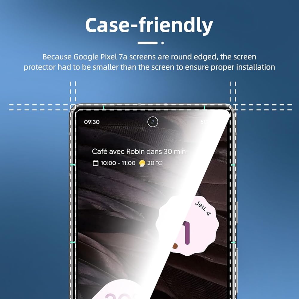The screen protector provides the maximum protection for the Google Pixel 7a touchscreen. The space between Google Pixel 7a and the screen protector enables the proper space for the installation of most phone cases.