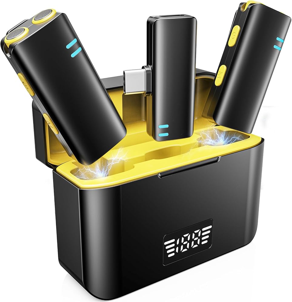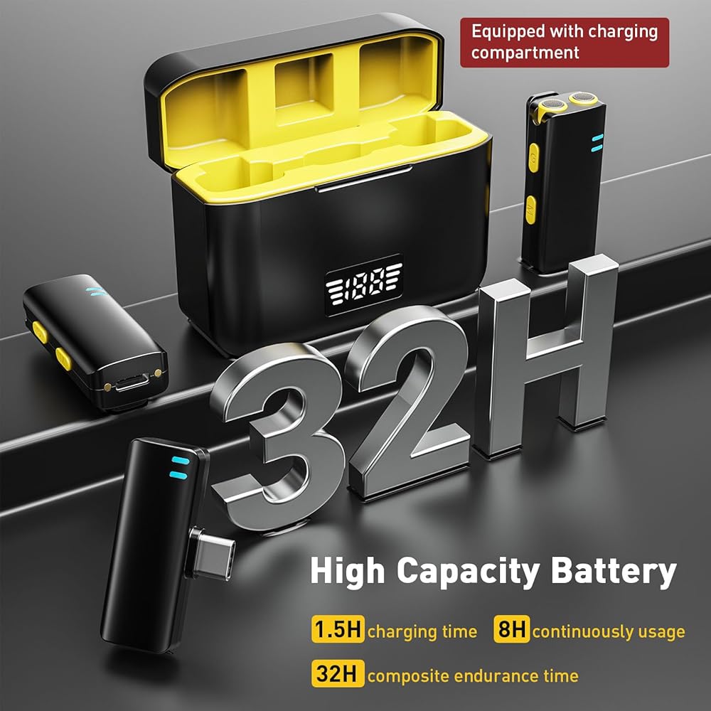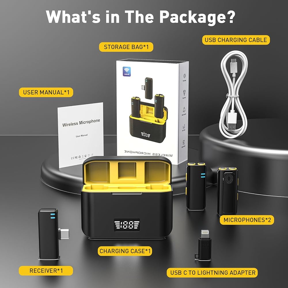 【Warm Tips & 1 Year Warranty】 package include:1* charging case, 1* type-c receiver, 2* wireless microphone, 1* type-c to lightning adapter, 2* type-c charging cable, 1* manual.Please read the manual and full charge the wireless lavalier microphone before using it for the 1st time. we provide 24 hours consult service & 12 months warranty to satisfied with your purchasing.