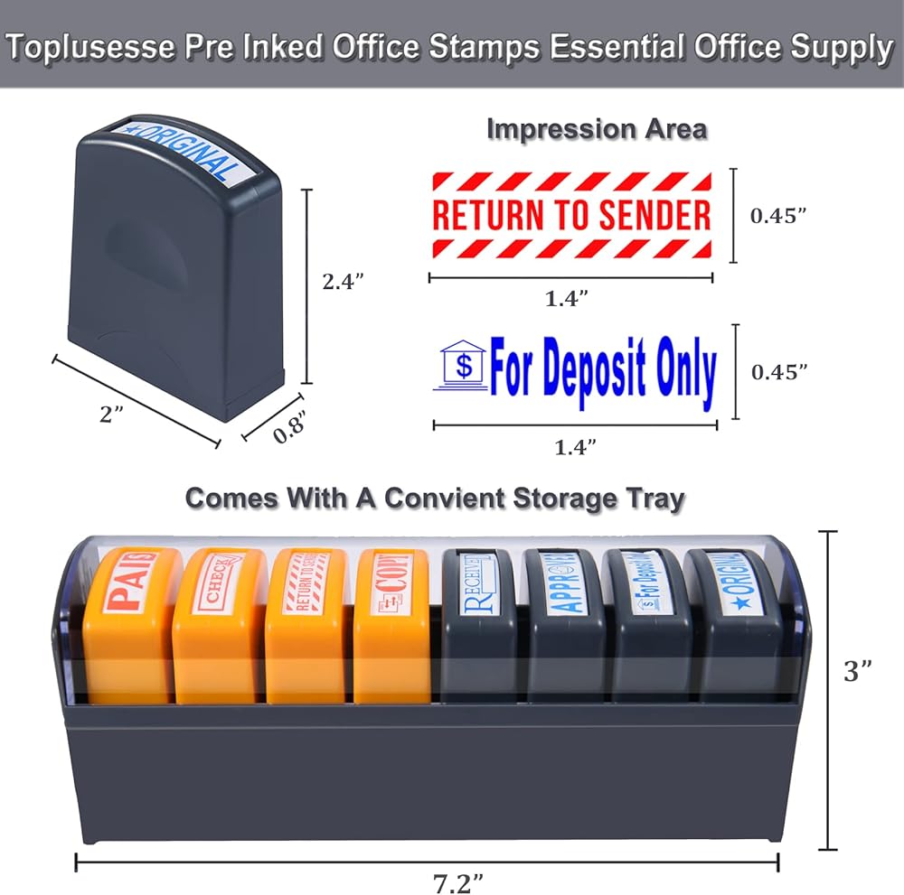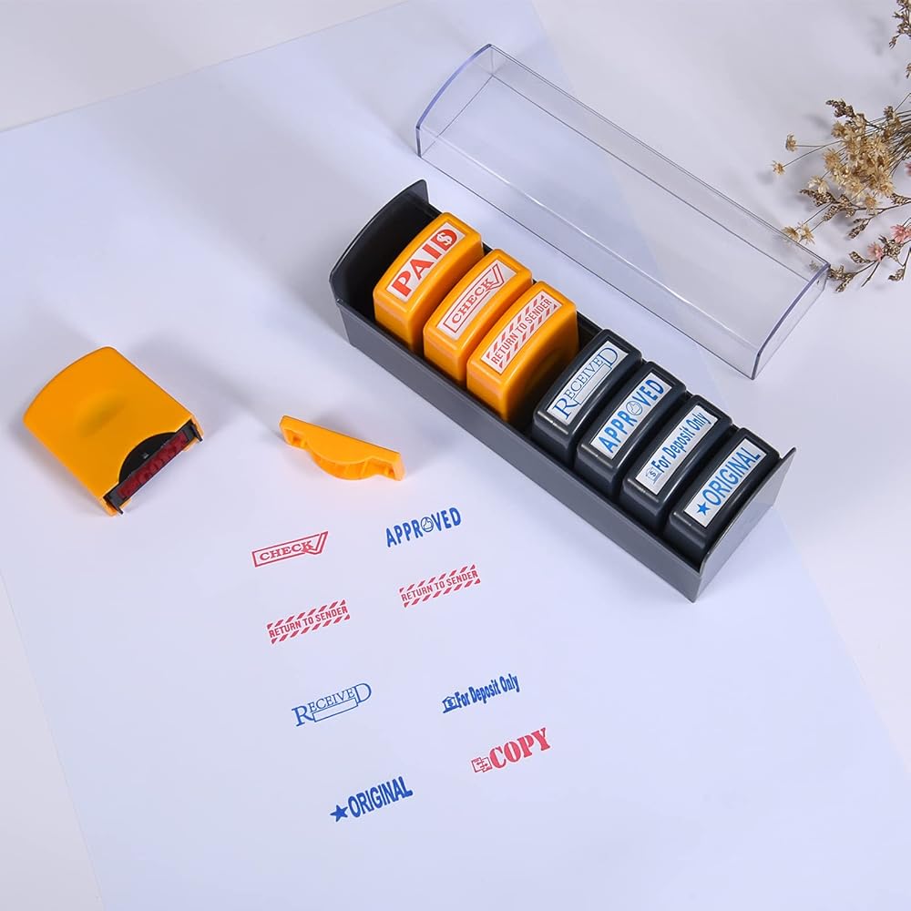 【Time Saver Rubber Stamps For Business】The self-inking office stamps are perfect solutions for your bulk daily office paperwork, family owned business, home office and startup, greatly improved work efficiency. Essential business supplies for you to get all your office paperwork organized. 8 pcs office stamps come with all the phrases and different ink colors to best fit your requirements: COPY/ PAID/ RETURN TO SENDER/ CHECK are in red ink; ORIGINAL/ APPROVED/ For Deposit Only/ RECEIVED are in blue ink.