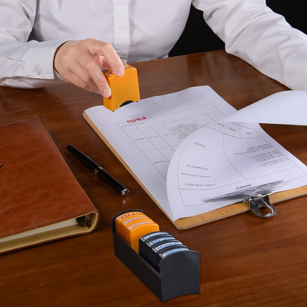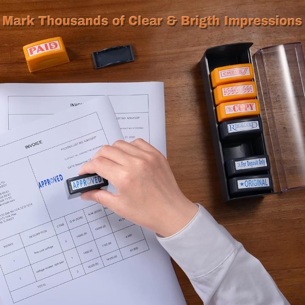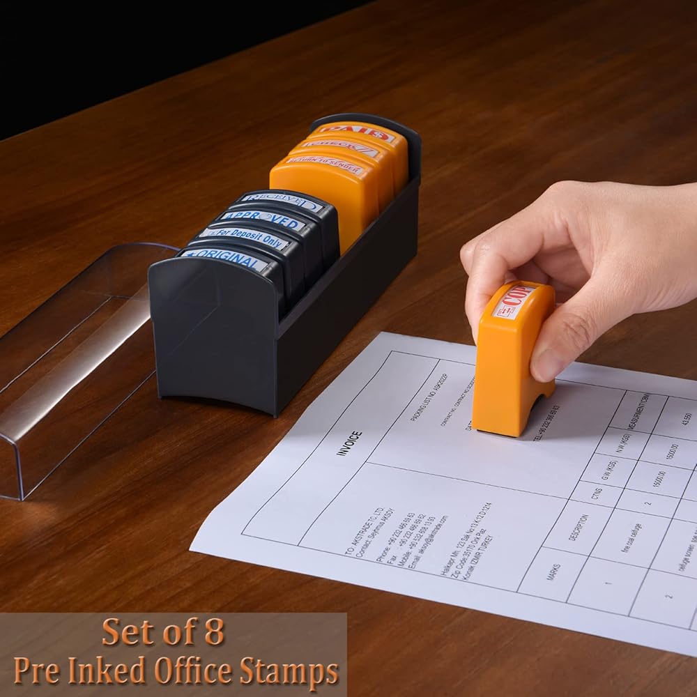 【Self Inking Office Stamp Set For Business】The set of 8 Pre-inked office stamps are designed to dealing with bulk repetitive working documents with efficiency. 8 Practical phrases & bright colors for all your business stamping needs. The long-lasting office stamps last over 3,0000 bright and clean imprints, won't messy your hands or bleed through papers. Pls kindly test a few times when first using the stamps, or they may ruin your papers due to too much ink.