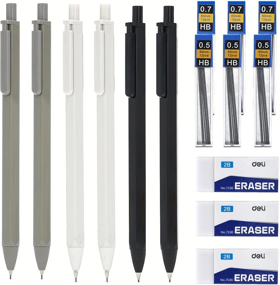 [Package Includes]: You will receive a box of 6pcs aesthetic mechanical pencils, 6 tube 0.5 & 0.7mm lead refills, 3pcs erasers