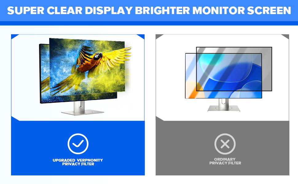 【Crystal-Clear Display and Aesthetic Screen】: Getting rid of a blurry screen with the ordinary privacy screen filter on, VERPONITY researched and upgraded a monitor privacy screen designed with advanced translucent layer to provide you a crystal clear HD screen display that surpass ordinary privacy films found on the market.Preserving the original brightness and true color of your screen. If you are looking for a HD clear computer privacy screen, choose us and you will not be disappointed.