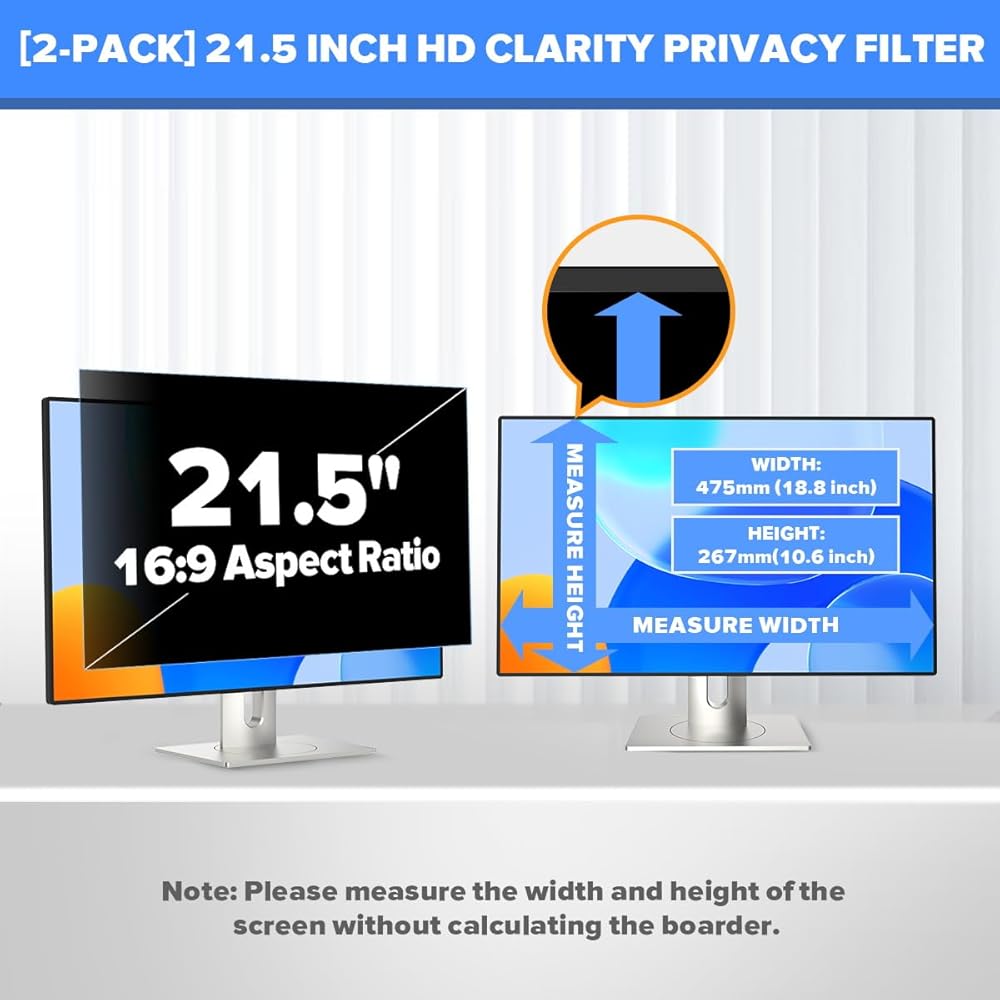 【2 Pack Ultra Slim Film】: To give you a modern and beautiful computer screen, this 2-pack privacy screen 21.5 inch monitor is designed to be thinner than computer privacy screen on Amazon market.Say goodbye to bulk and weight filters, our privacy screen for computer monitor reaches removable and reusable with the slim design. With the size of width 20.8"(475mm) and height 11.7"(267mm), it is compatible with the 23.8 inch privacy screen for monitor. It could removed easily when you don't need it.