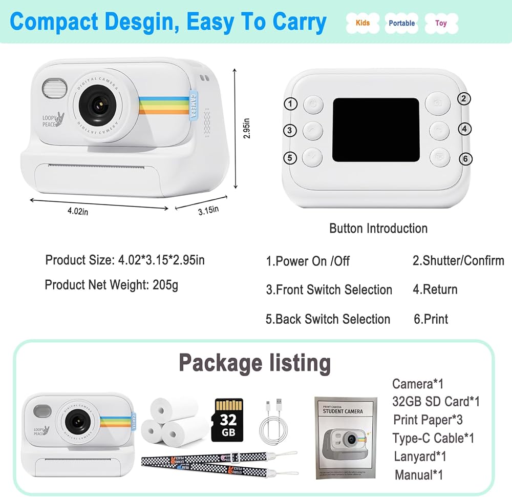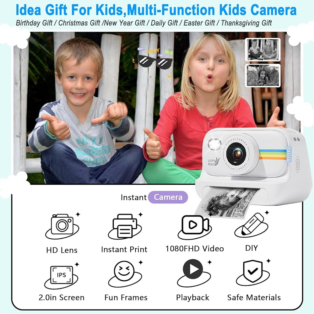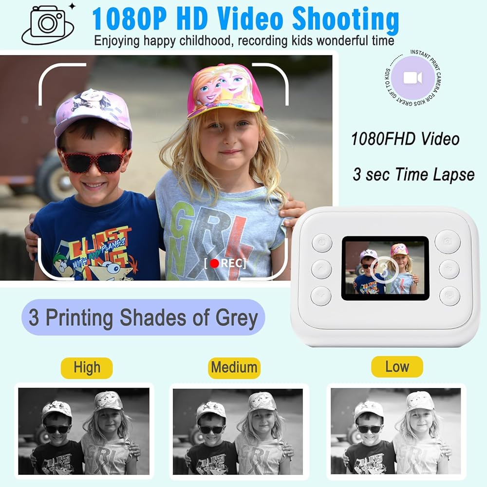 كاميرا طباعة فورية للأطفال، هدايا عيد الميلاد لعيد الميلاد لمدة 4 5 6 7 8 9 10 11 12 فتاة بنين، كاميرا فيديو رقمية عالية الدقة للأطفال الصغار، هدايا إبداعية للفتيات من سن 4 إلى 12 عامًا مع بطاقة SD سعة 32 جيجابايت - أبيض