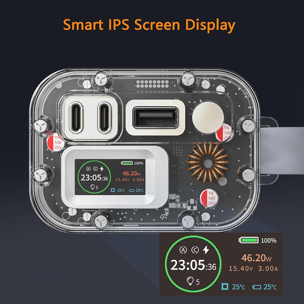【Smart IPS Display Screen】The battery power, output power, chip operating temperature, battery working temperature, working time, and working ports are visualized in a clear, concise, and intuitive way throughout the entire charging/discharging process.