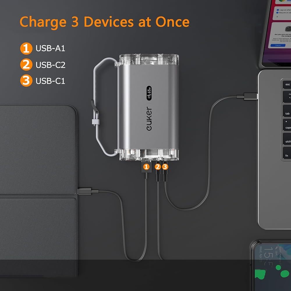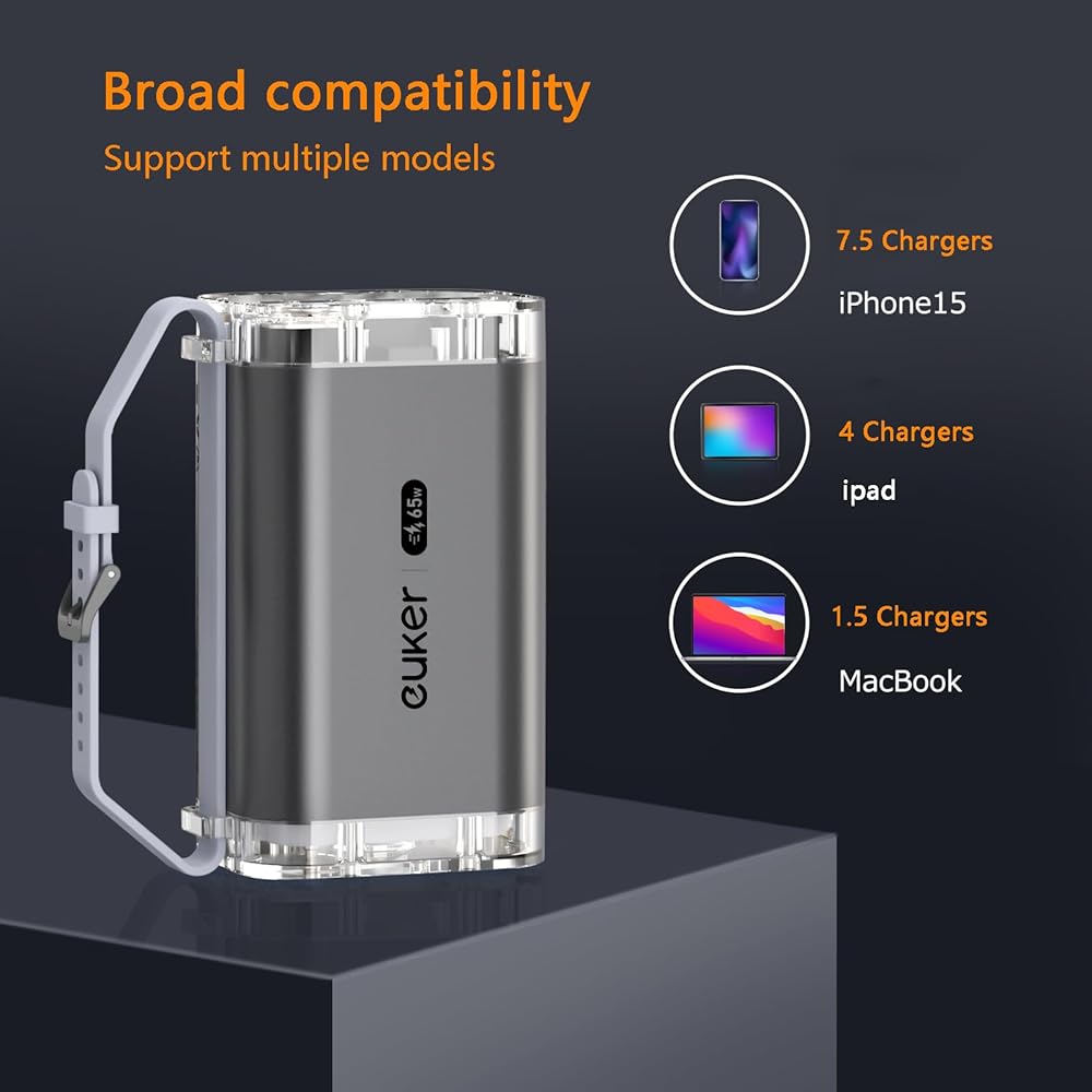 【Universal Compatibility】Equipped with a PD100W USB C1 port, PD30W USB C2 port, and 18W USB A1/A2 ports, supporting a maximum output of 100W, the Euker 100W portable power bank can charge four devices simultaneously, compatible with laptops, phones, iPads, and more devices with USB C/USB A ports, meeting all your charging needs.