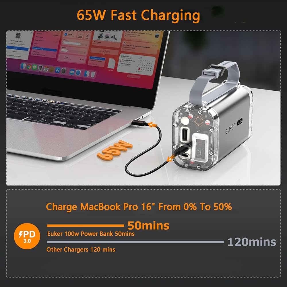 【100W PD Bi-Directional Fast Charging/Discharging】The portable power bank is equipped with a PD 100W USB C port, which can be used with a 100W USB C cable (included) and charger (not included) to fast charge a 16" MacBook Pro from 0% to 50% in 40 minutes, faster than the original charger, saving more time.