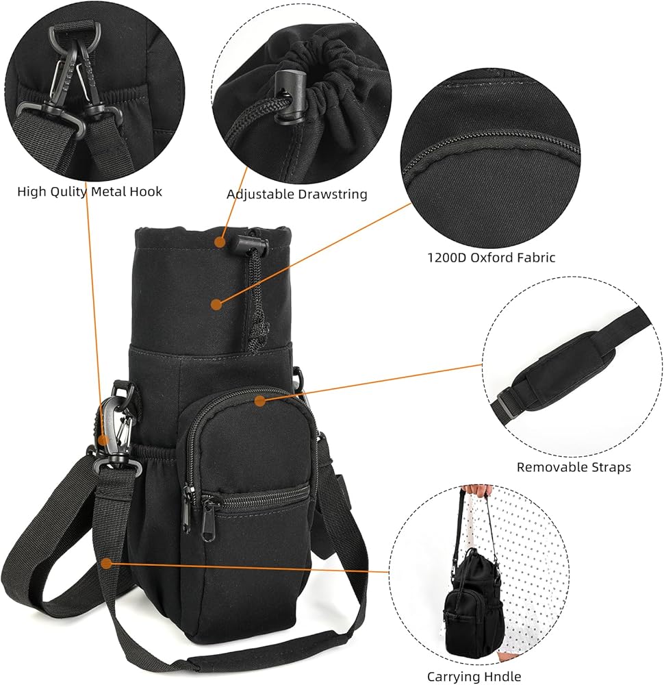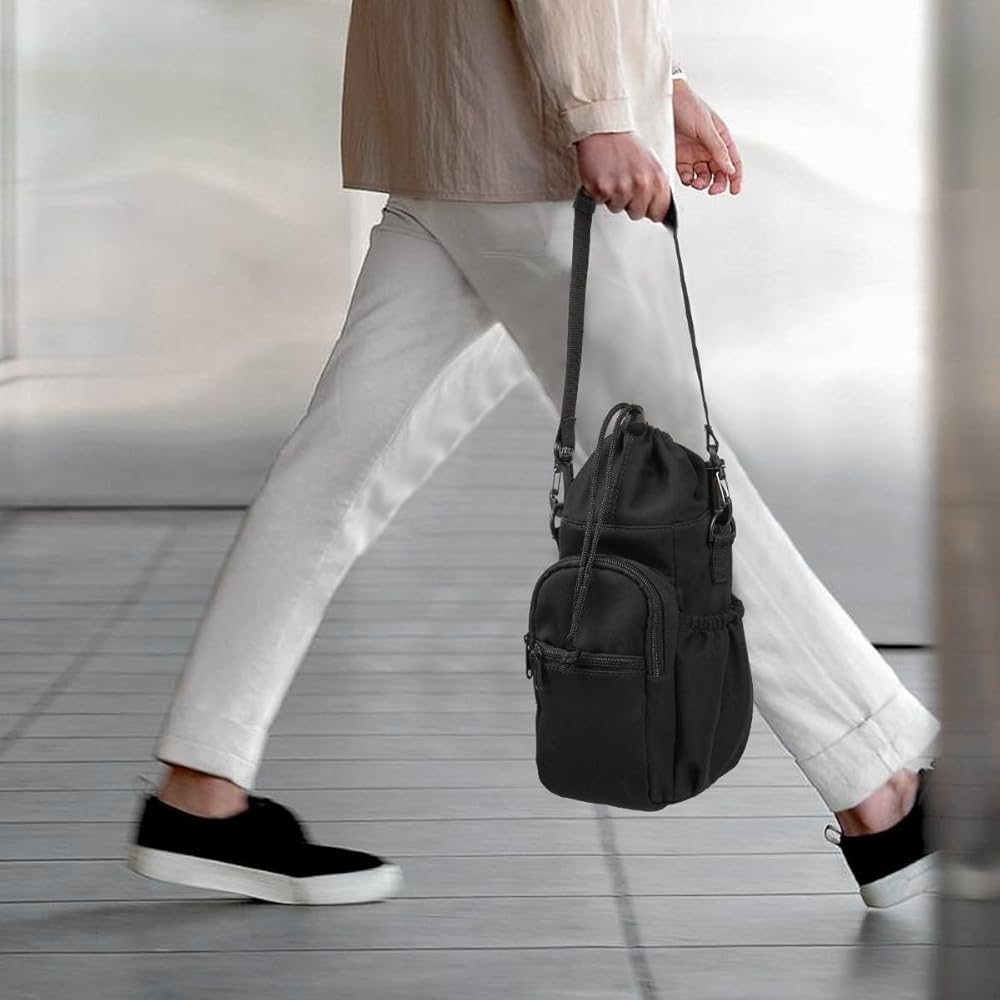 DRAWSTRING AND MUTIPLE POCKETS - Our insulated water bottle with strap provides plenty of space for all your personal belongings. The main pocket, equipped with a user-friendly drawstring closure, provides easy access to insert and remove your bottle. Meanwhile, two front zippered pockets with secure key leashes pockets for smartphone, cash, card, keys and other small items, while two slip-in side pockets provide a handy spot for snacks