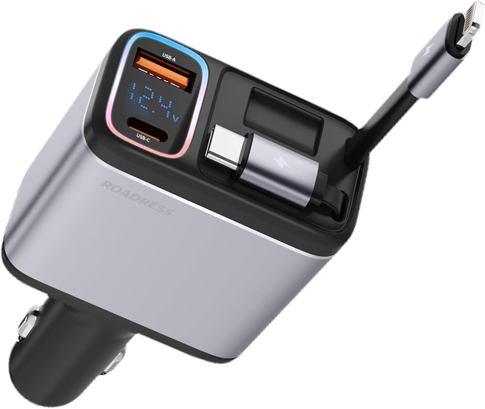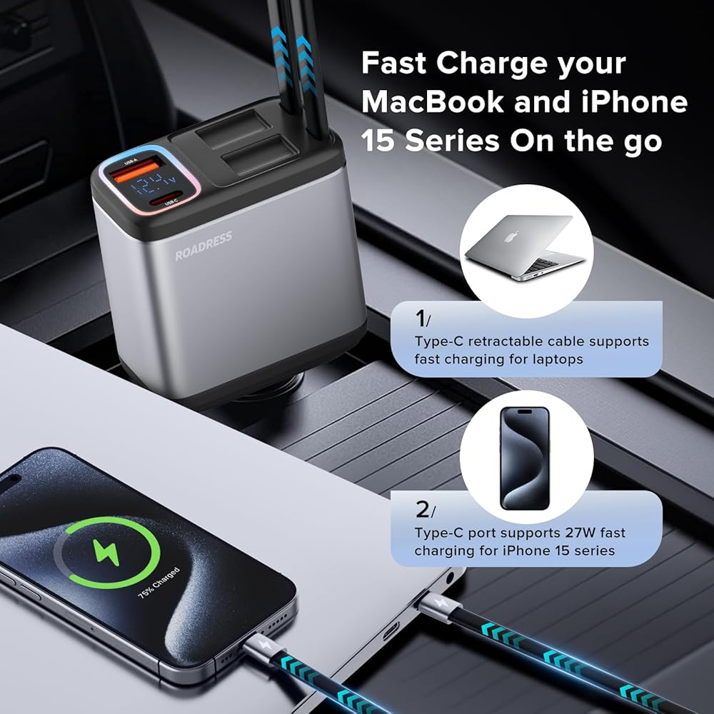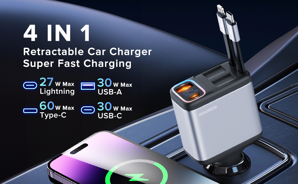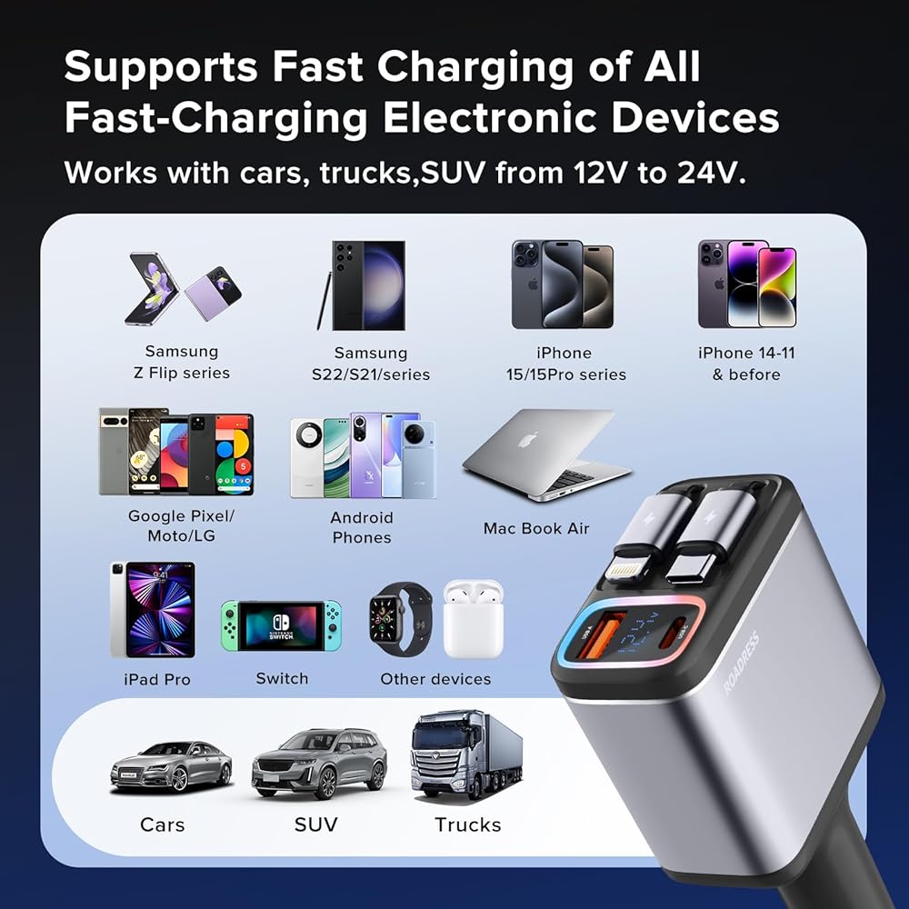 【4 in 1 Retractable Car Charger】Build-in 2 retractable charging cables (Type-C/lightning) + 2 ports (Type-C/USB),can charge 4 devices at the same time. Retractable cable free retractable up to 27.56inch, easy charging in the back seat, keep the car neat and tidy.