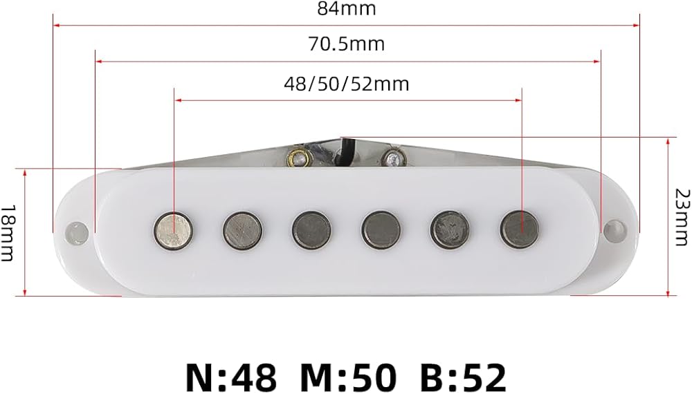 - Pickup Pole Spacing:Neck-48mm(marked TJ-48 on the bottom),Middle-50mm(marked TJ-50),Bridge-52mm(marked TJ-52)