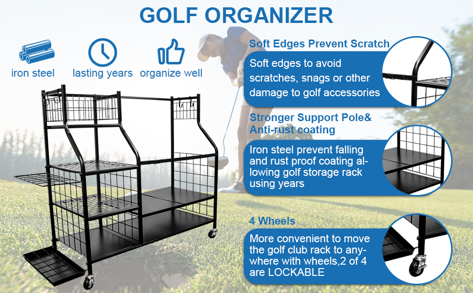 [رف جولف قوي ومريح] استمتع بالراحة والمتانة التي يوفرها منظم رفوف الجولف القوي هذا. مع أربع عجلات قابلة للتحريك، يسهل نقل هذا الرف إلى أي مكان تريده. يمكن قفل العجلات للحفاظ على ثبات الرف في وضع واحد، حتى لو لم يكن على الحائط. حافظ على معدات الجولف الخاصة بك منظمة ويمكن الوصول إليها بسهولة مع منظم رفوف الجولف متعدد الاستخدامات هذا.