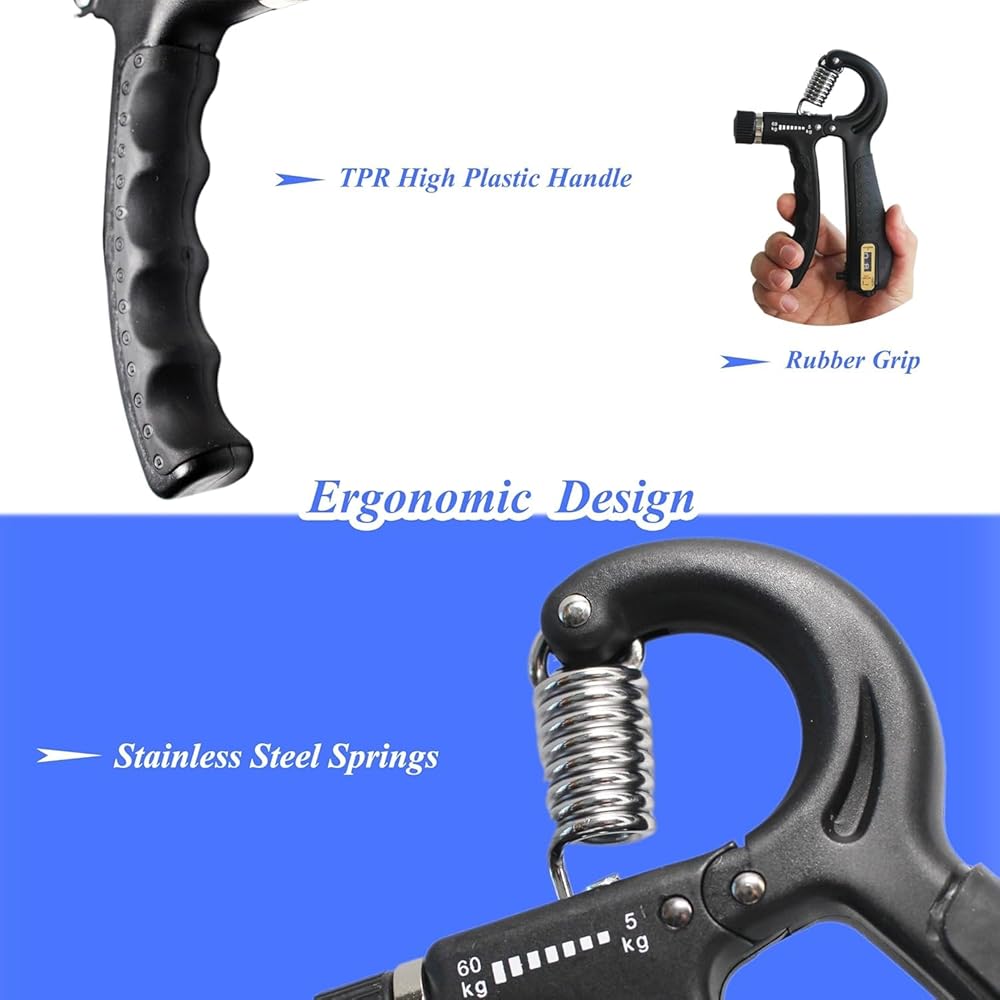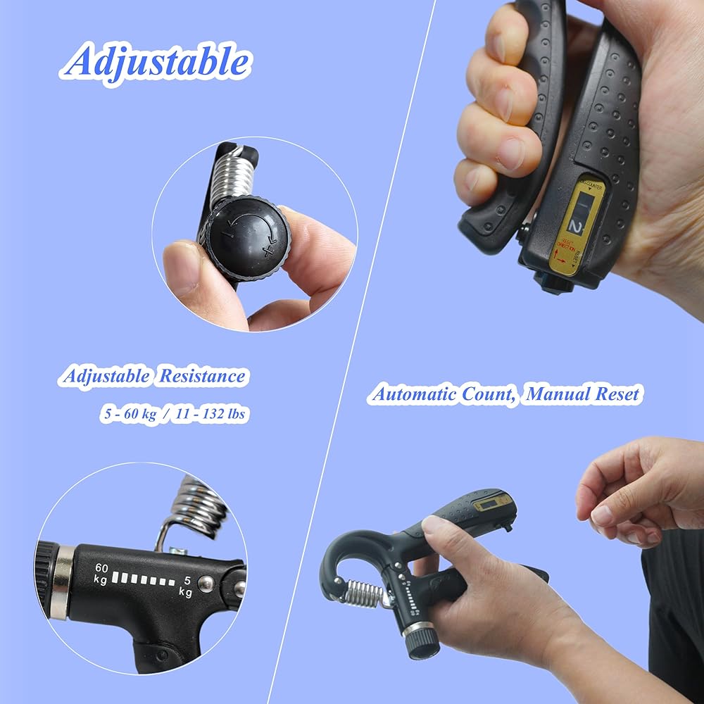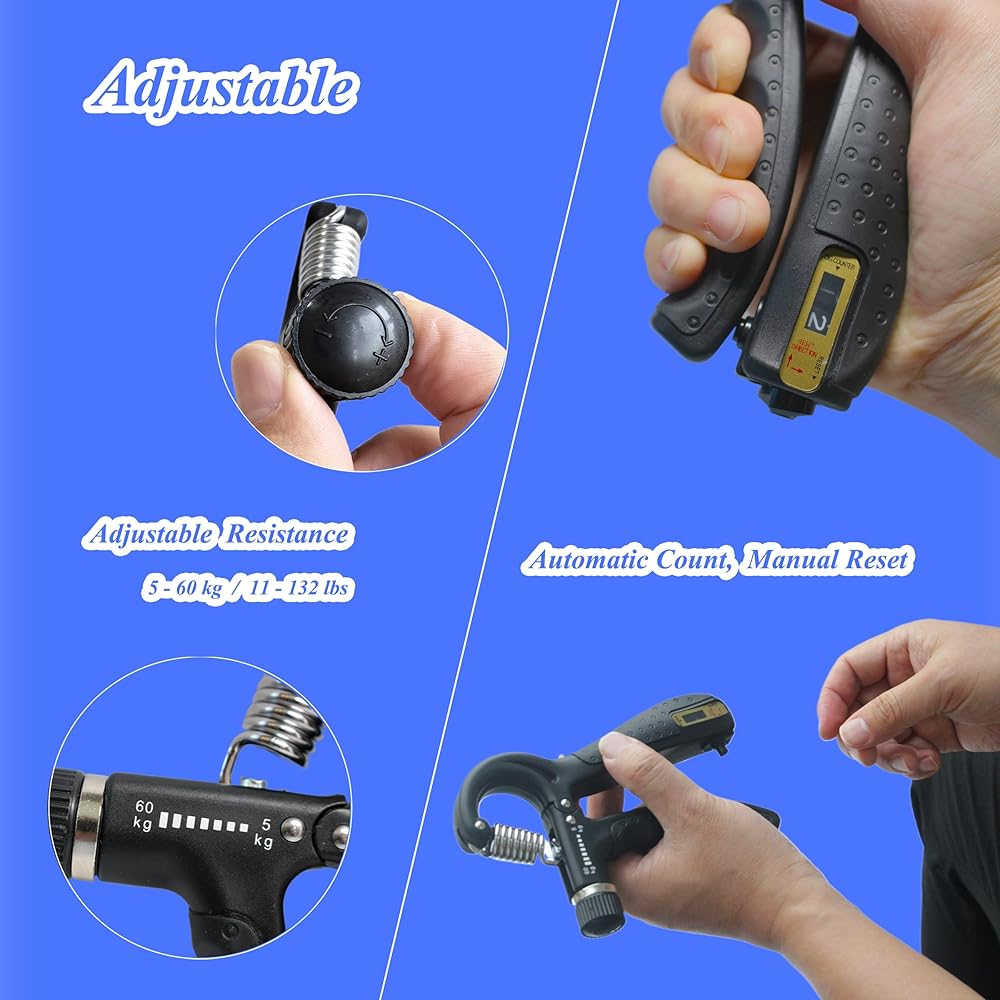 Enhance your strength training regimen with Duomspiace Grip Strength Trainer, the ultimate accessory for your gym and boxing routines. Our device is designed not just to improve your grip strength but also aid in effective rehabilitation training, helping those suffering from arthritis, tendonitis, carpal tunnel, and other conditions. The smart counting feature tracks your progress effortlessly, ensuring you're always aware of your achievements. With an adjustable resistance ranging from 11lbs to 132lbs, our device caters to athletes, musicians, rock climbers, tennis players, and anyone seeking to improve their wrist and finger strength. Take your personal gym with you, thanks to its lightweight and compact design. Work out while commuting, at home, or the office, enjoying the flexibility of grip strength training anywhere. With two fully adjustable hand grips for efficient hand training, witness faster muscle growth. Trust in Duomspiace, where we strive to deliver quality products and superior customer service. . Unleash your full potential with the Duomspiace Grip Strength Trainer – your ultimate strength training companion!