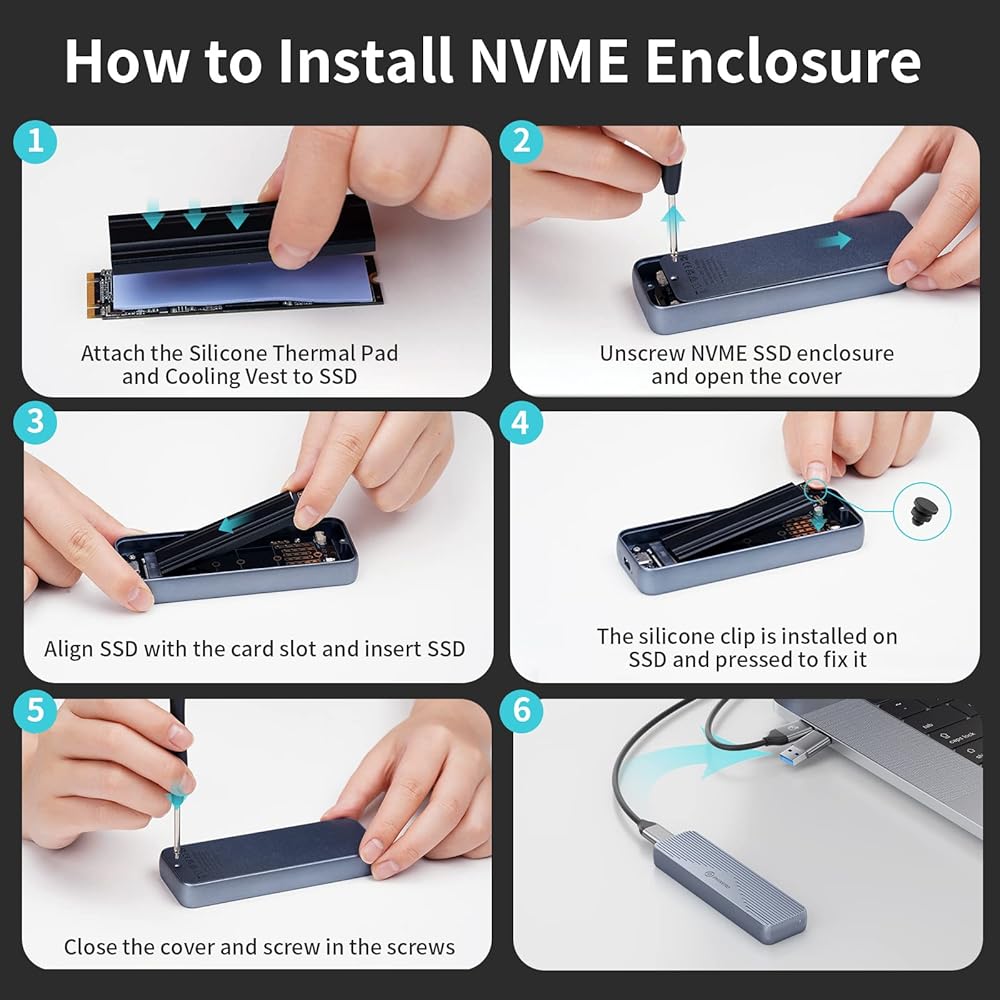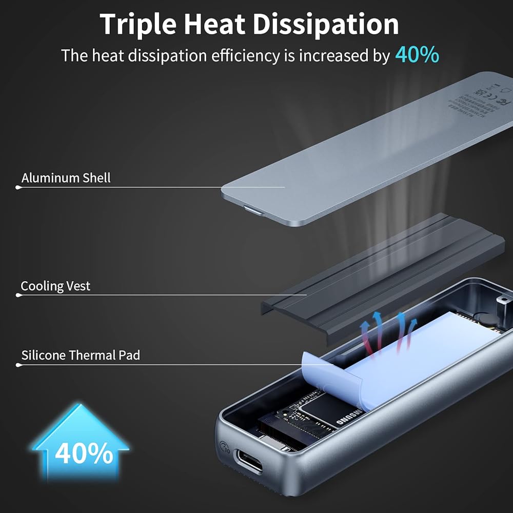 【Triple Heat Dissipation】 Heat dissipation efficiency of NVME enclosure is increased by 40%. The sandwich structure composed of 'aluminum shell—cooling vest—silicone thermal pad' closely contacts M.2 SSD, and quickly transfers the heat generated by SSD to the aluminum shell. The groove design on the surface of the M.2 NVMe SSD enclosure effectively increases the heat dissipation area