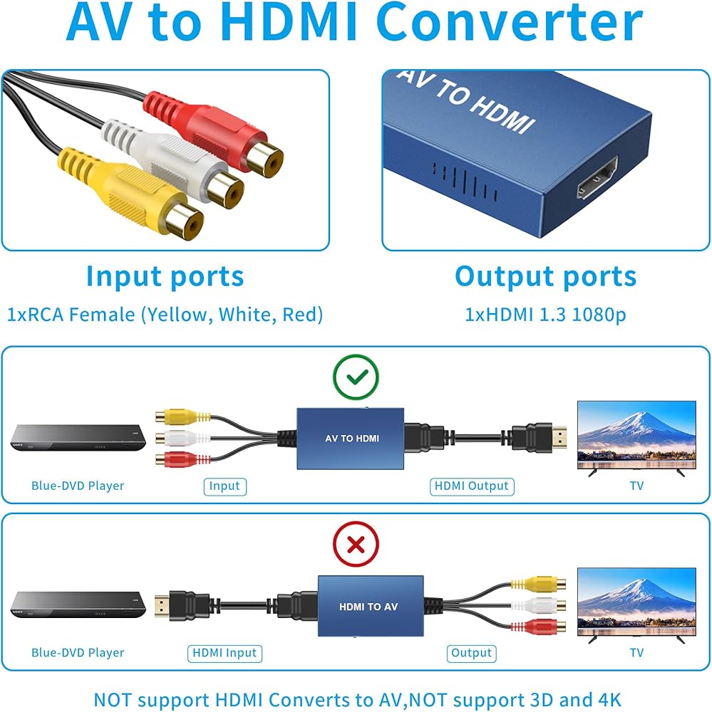 Input ports: 1xRCA Female (Yellow, White, Red), Output ports: 1xHDMI 1.3 1080p. NOT support 3D and 4K, NOT support HDMI Converts to AV