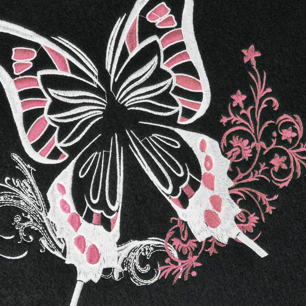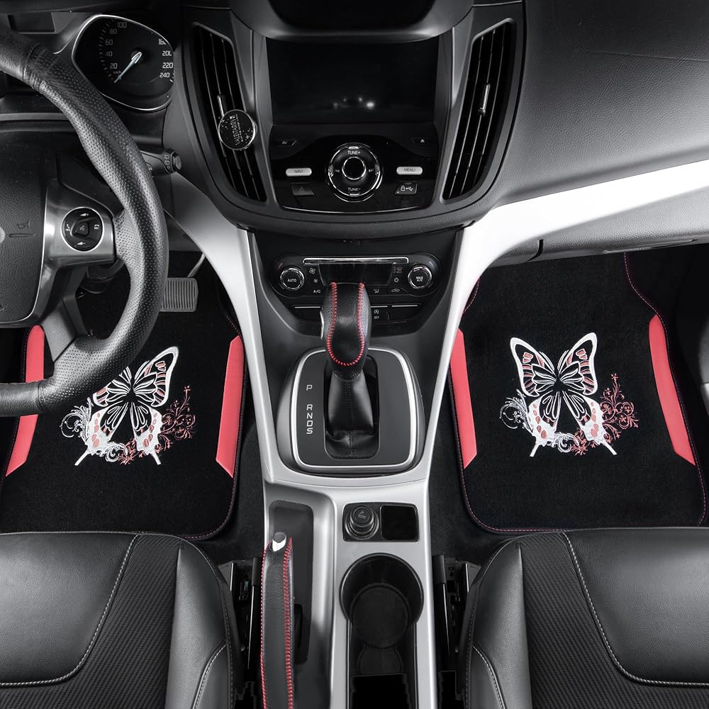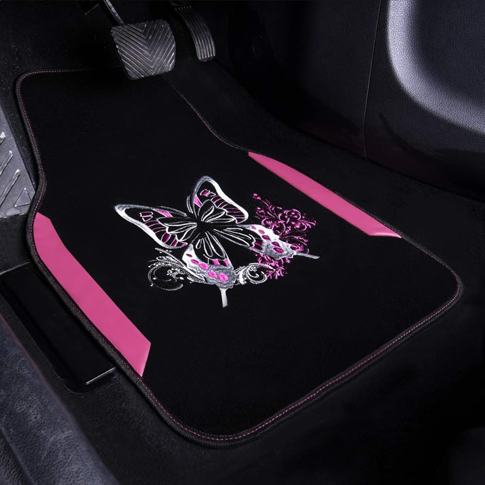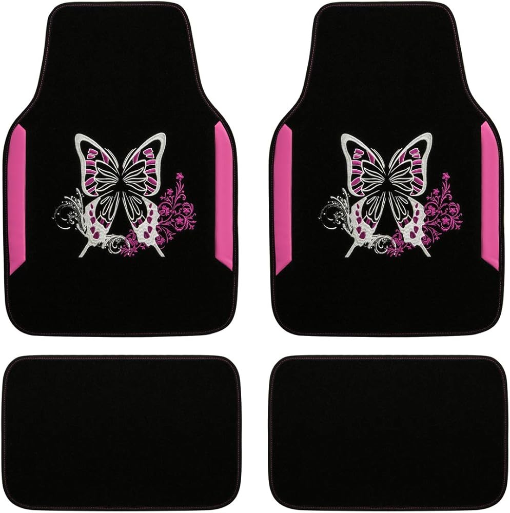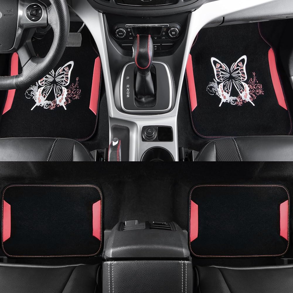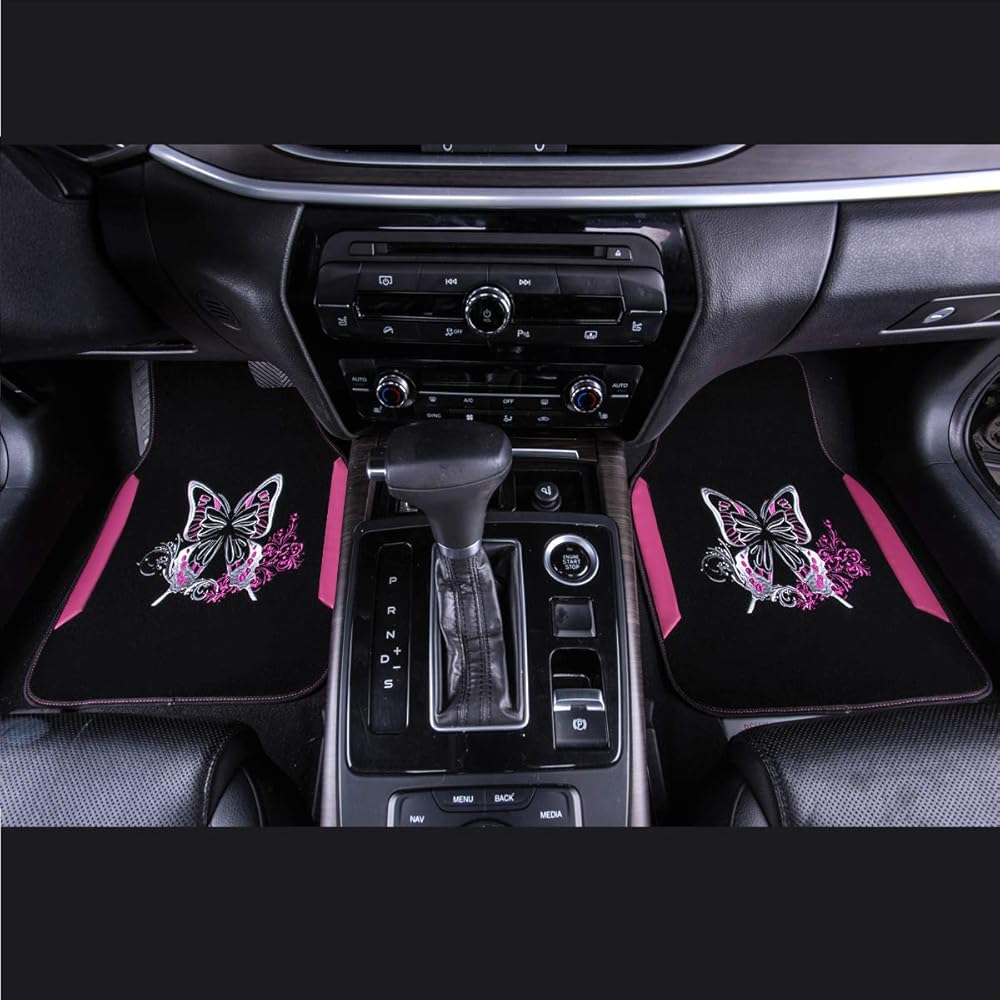CAR Pass Embroidery Butterfly Car Floor Mats, Leather Pink Carpet Floor mats with Heel Pad for Cute Women Girl, Universal Fit for Suvs,Sedans,Trucks,Cars, Set of 4 (Black and Pink)