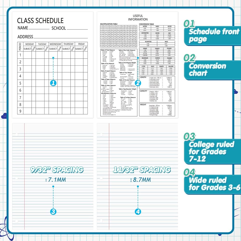 The notebook set includes 5 notebooks of 60 sheets (120 pages), giving you plenty of quantity to take notes in school, college or at work. The cute composition notebooks have more space between lines for larger handwriting, 11/32" spacing between lines, makes a nice primary composition notebook.