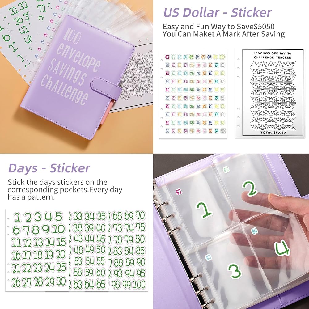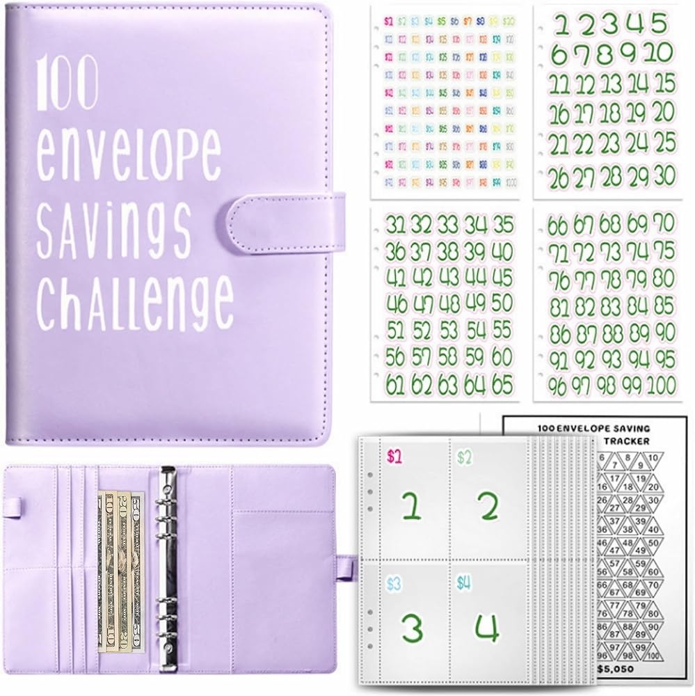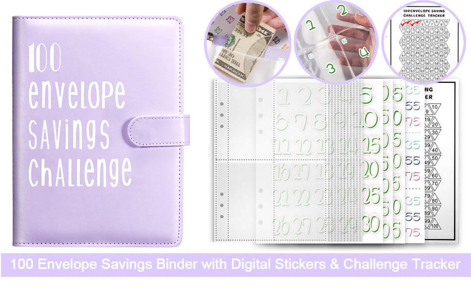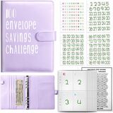 100 Envelope Challenge Binder Kit, A5 Money Saving Challenge Book with 25 Cash Envelopes, Cash Stuffing Binder with Digital Stickers, Purple Money Planner