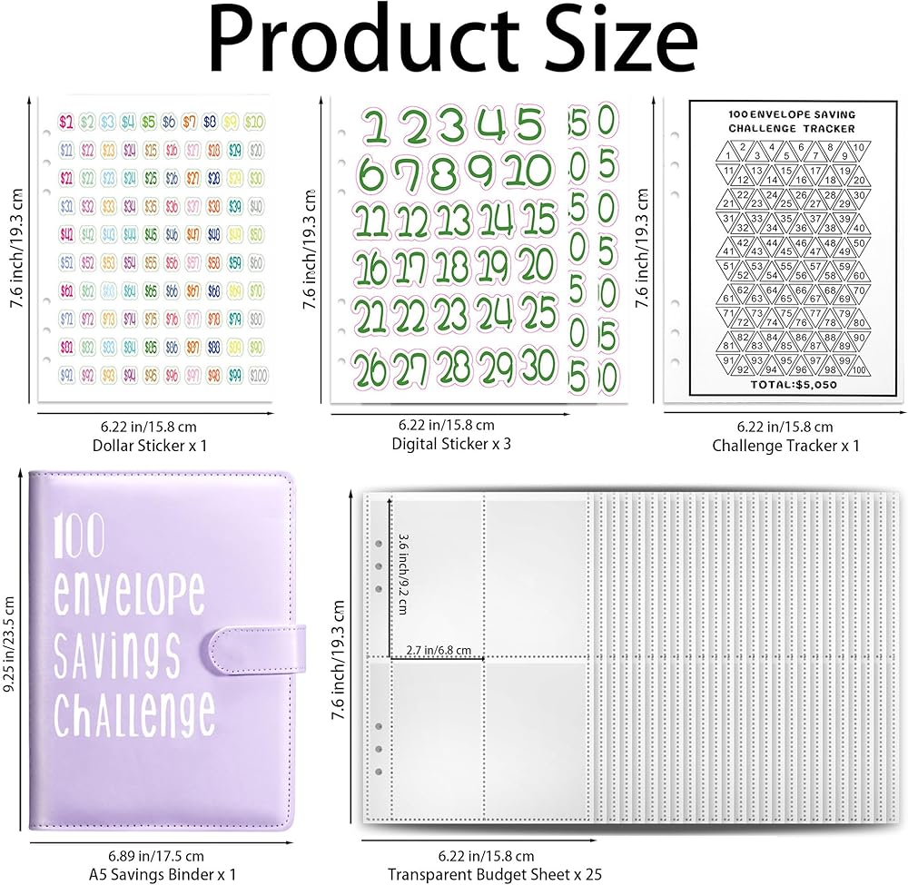 • 100 day envelope challenge kit includes a A5 size PU leather savings challenges book (6.89 inch x 9.25 inch/17.5cm x 23.5cm) and various colorful digital stickers. The cash envelope binder features built-in card slots, ticket slots and 2 pen loop holders, making it easy to store cards, pens, tickets and passports.