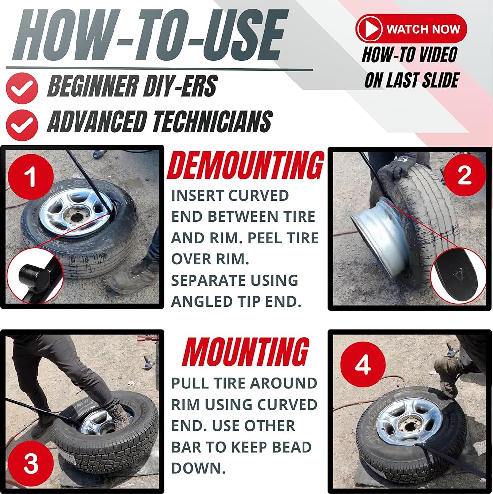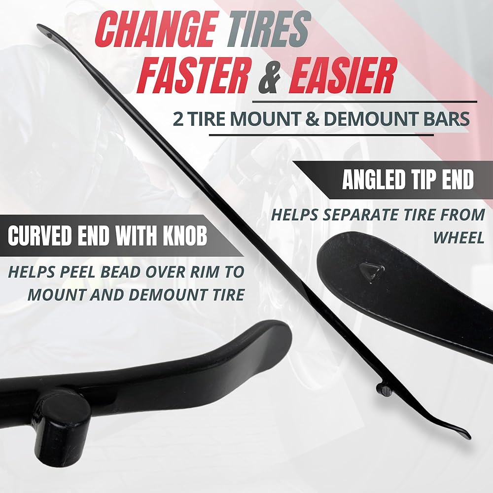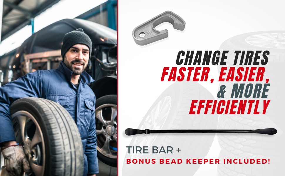 [CHANGE TIRES IN MINUTES] - Our Tire Iron is the best solution for removing and replacing tires. Change tires in a matter of minutes with this one simple tool. As a helping hand, use our included bead keeper to hold the tire bead down while mounting.