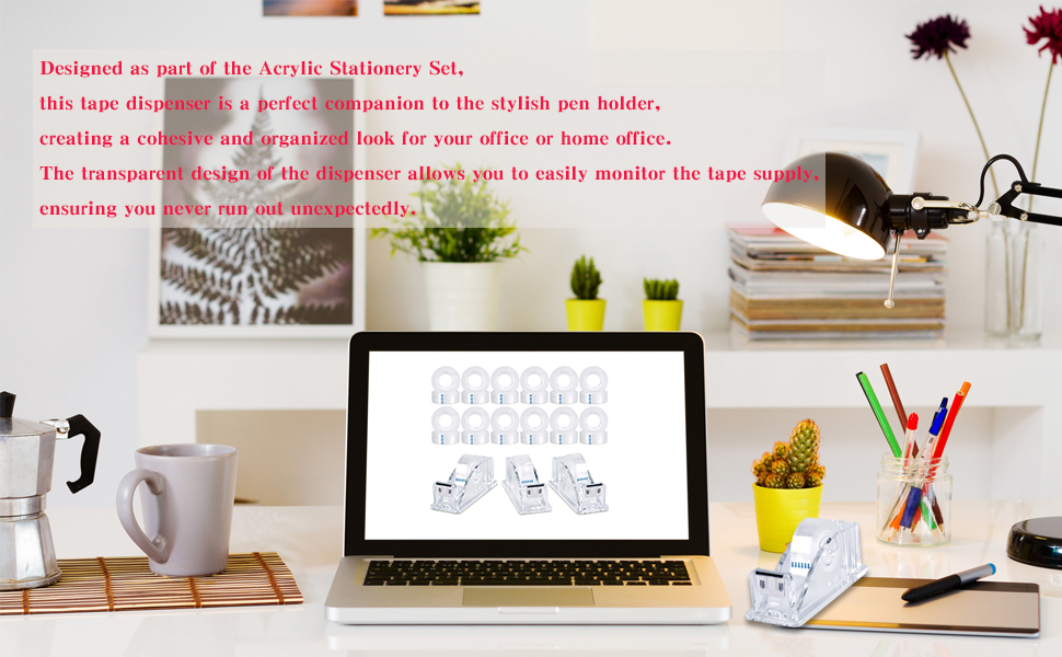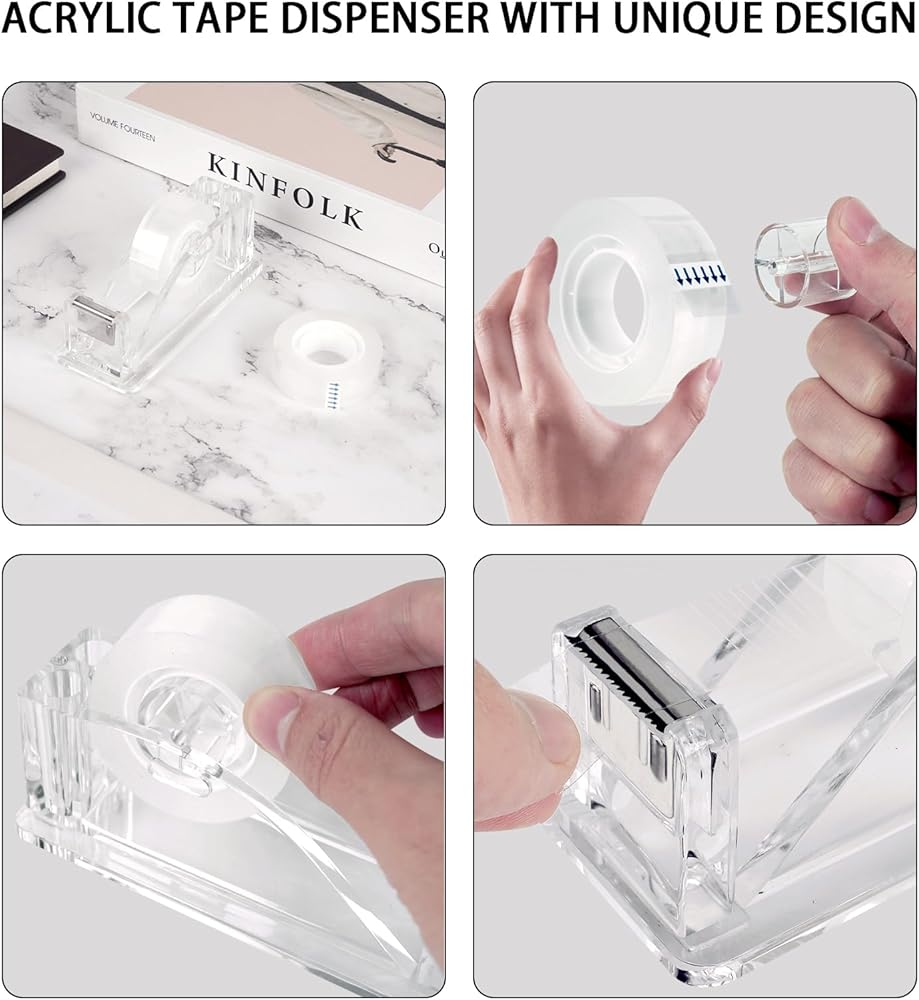 Tape Organizer: Crafted from premium acrylic material, assuring its endurance and stability. Immaculate transparency. It showcases two sections for housing two pens, providing easy accessibility. Its refined and contemporary design imparts a hint of sophistication to any desk or workspace.