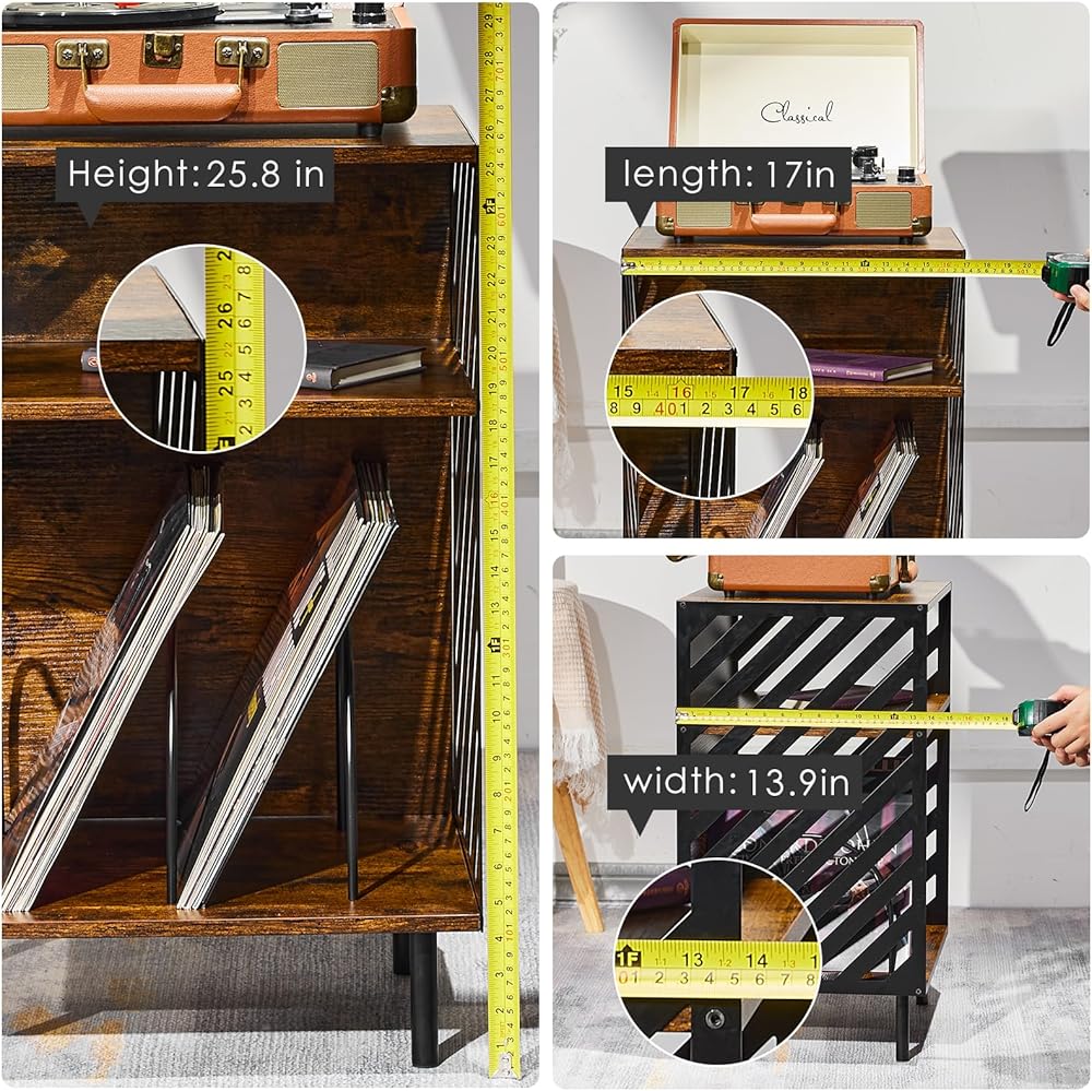 Record Player Shelf:The record player stand features durable ironwood construction with a vintage look that makes a great decorative addition to the home, the vintage record player table measures 17"L x 13.5"W x 25.5"H, holds 130 lbs and holds 180 records. Our products strive to provide you with a comfortable user experience.