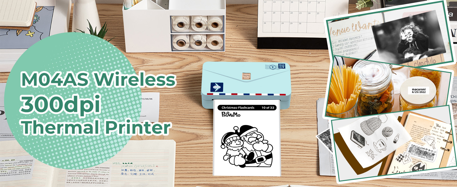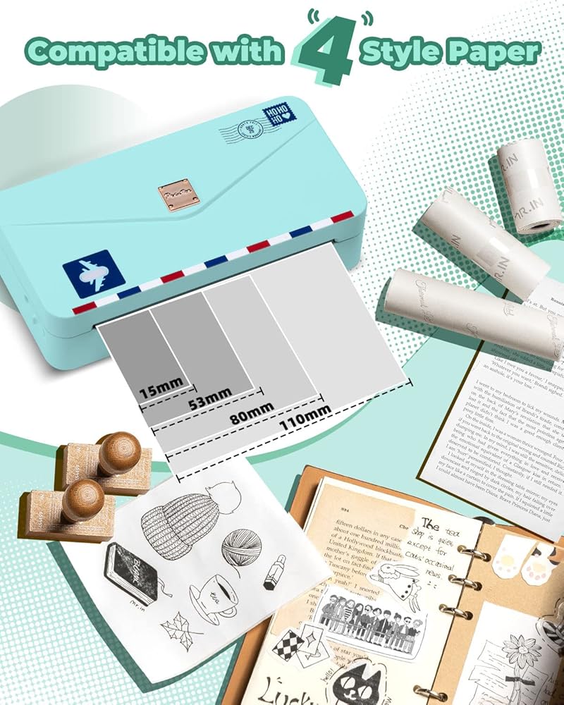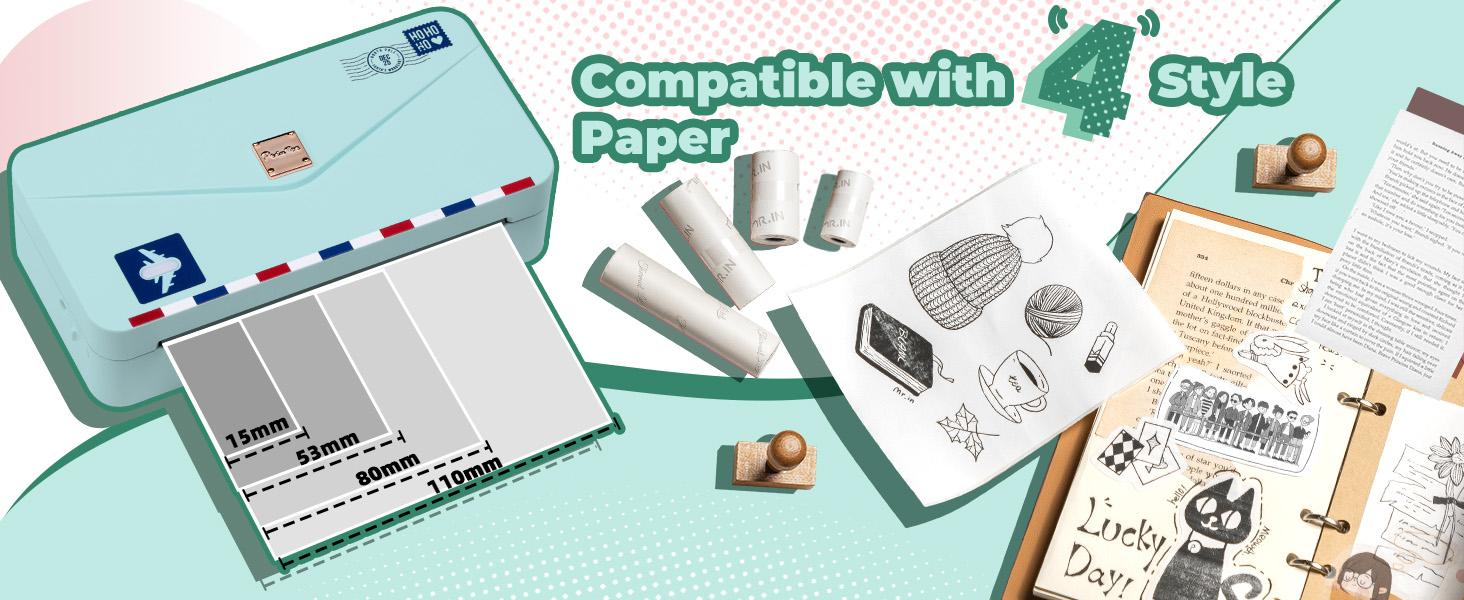 【Compatible with 4 Size Paper】Memoqueen M04AS portable mini thermal printer is compatible with 4 different sizes of paper (15mm/53mm/80mm/110mm) and more than 50 kinds of paper. It's also great that it supports white/transparent/color/sticker/non stick paper and has a novel envelope design. That makes printing more interesting and convenient.