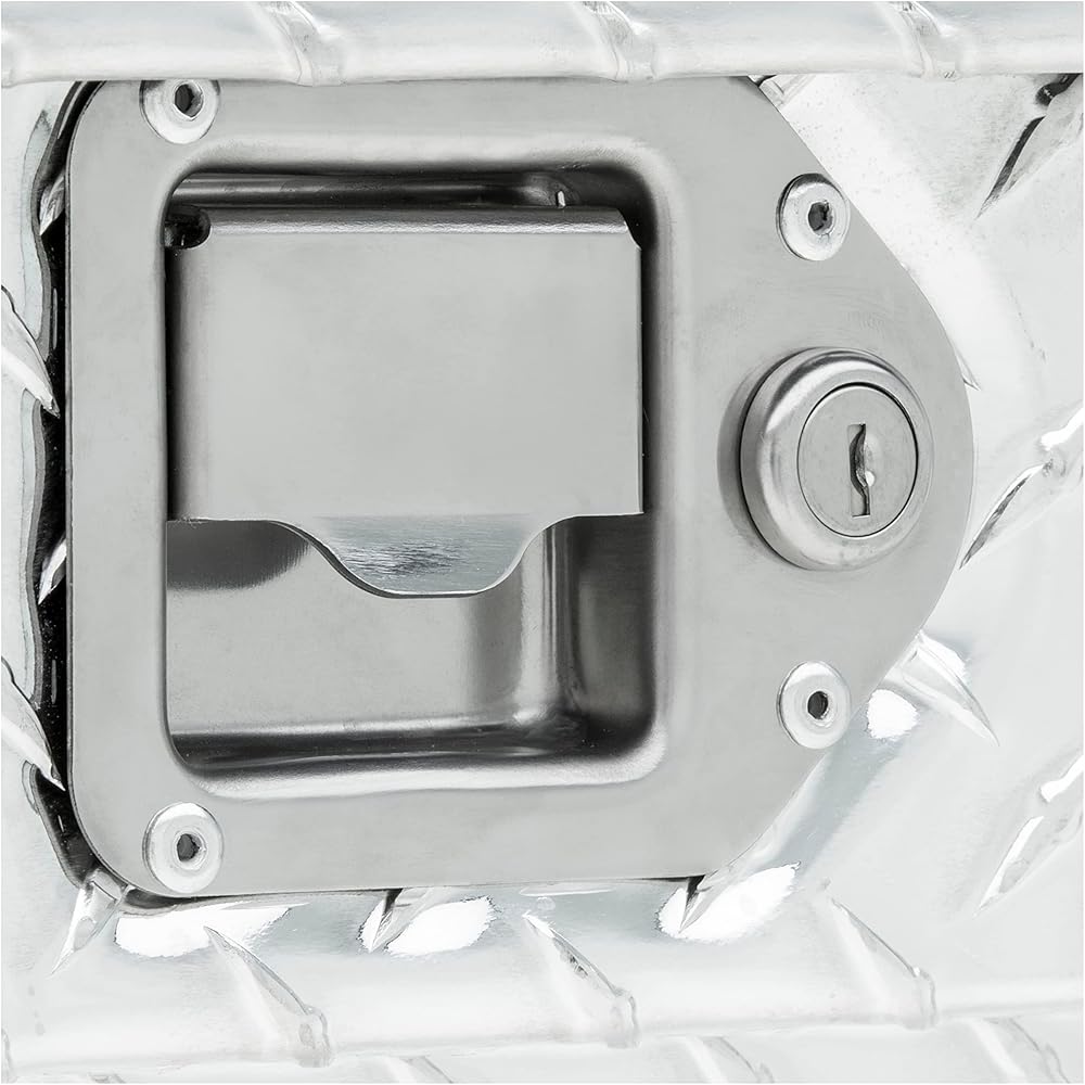 • STAINLESS STEEL HANDLE. This trailer storage box is equipped with a stainless steel locking handle for dependable security and long-lasting operation in spite of the elements