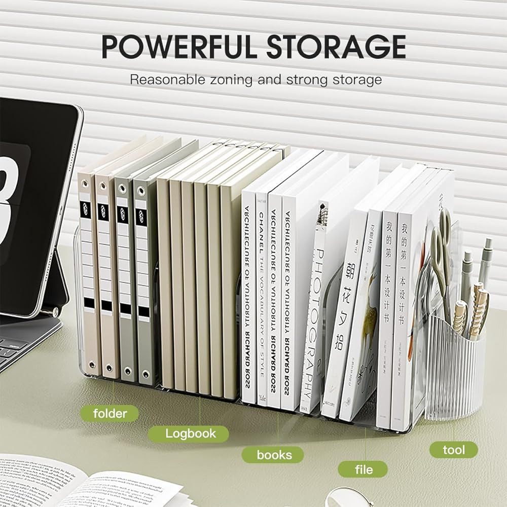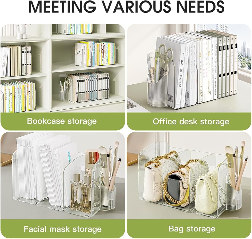 【4 compartments for storage】 Multi functional large capacity file storage rack, approximately 14.1 (inches) long x 5.5 (inches) wide x 5.9 (inches) high. It can store books, documents, wallets, facial mask and other items at the same time.