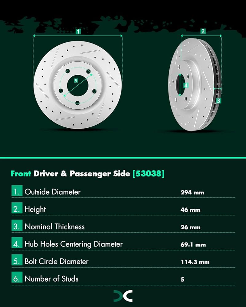 PERFORMANCE INPROVEMENT - Brake rotors drilled and slotted design provides upgrade effective braking power and heat dissipation while controlling noise,eliminating vibration harshness