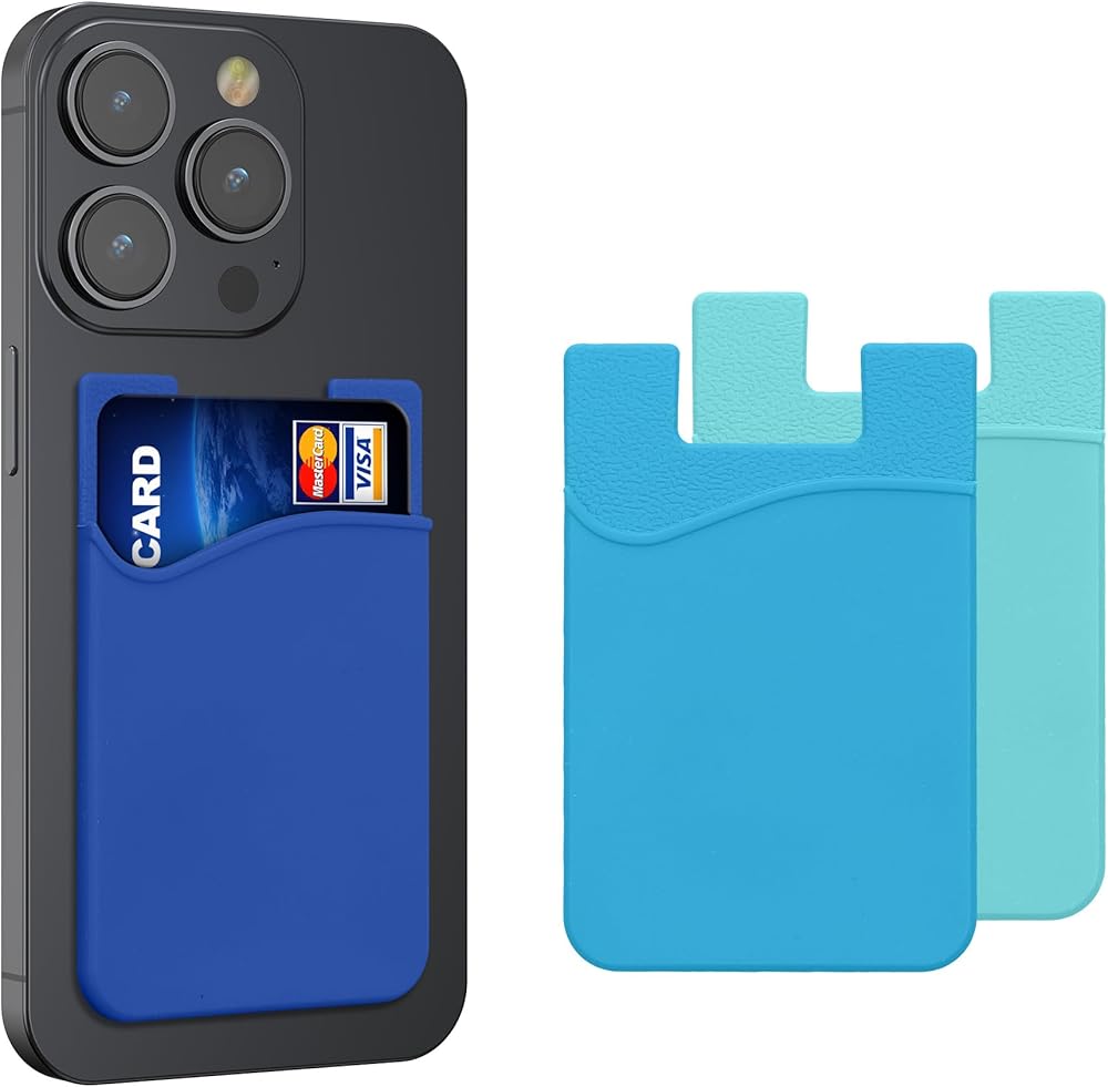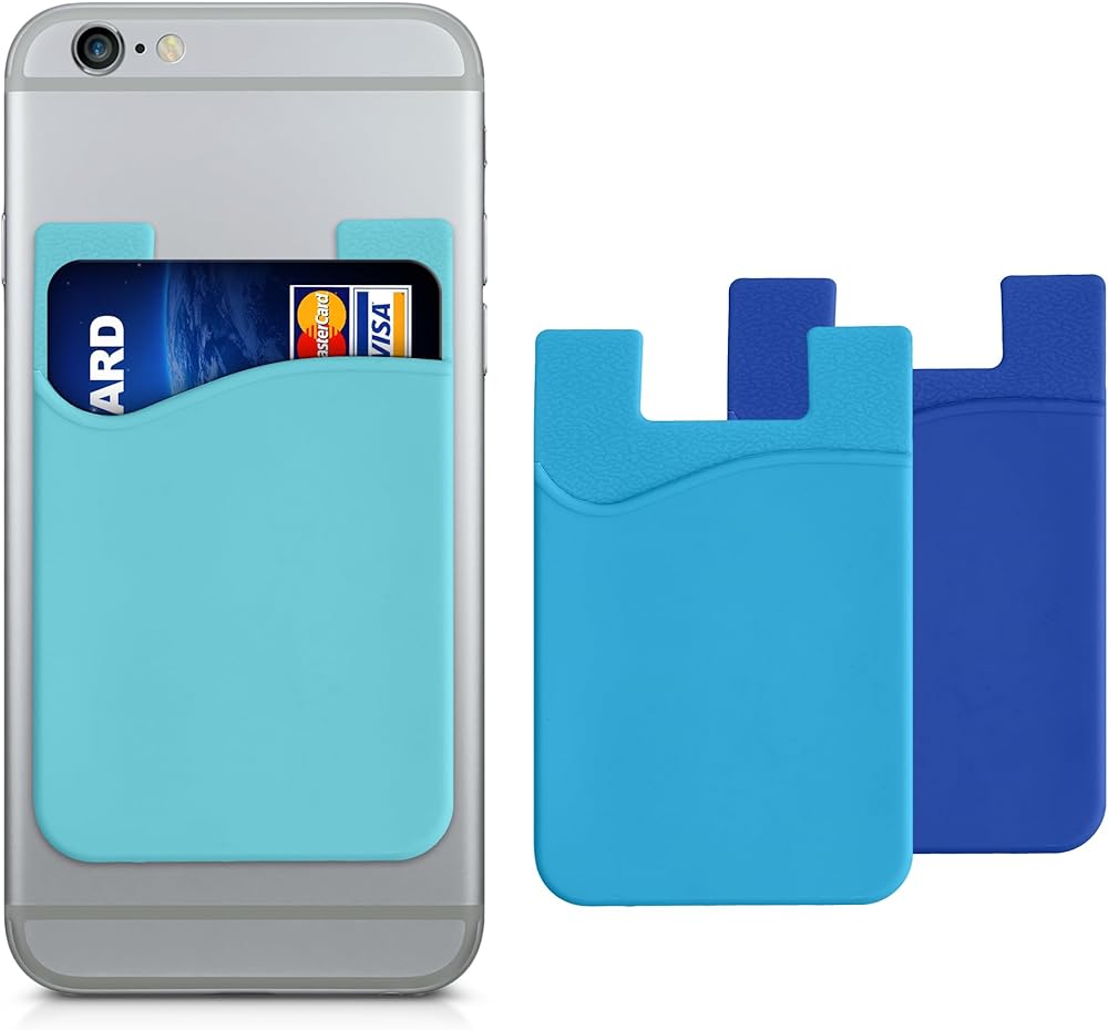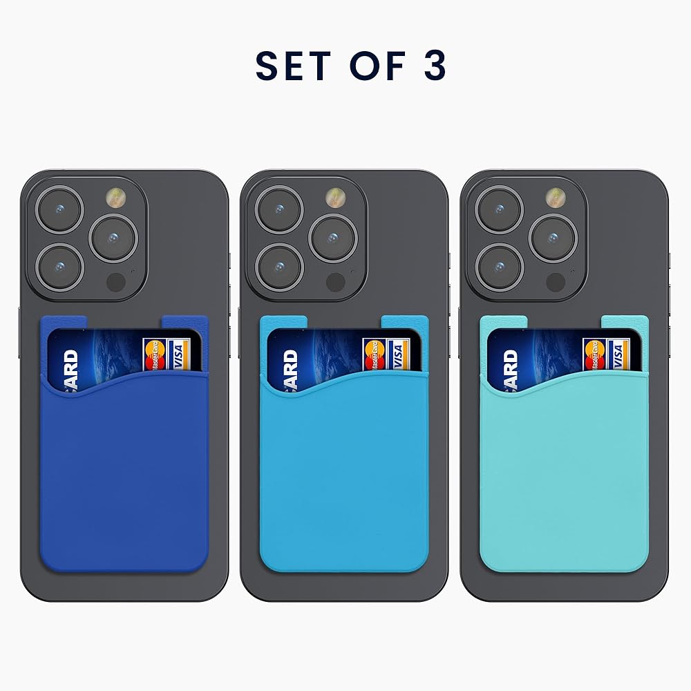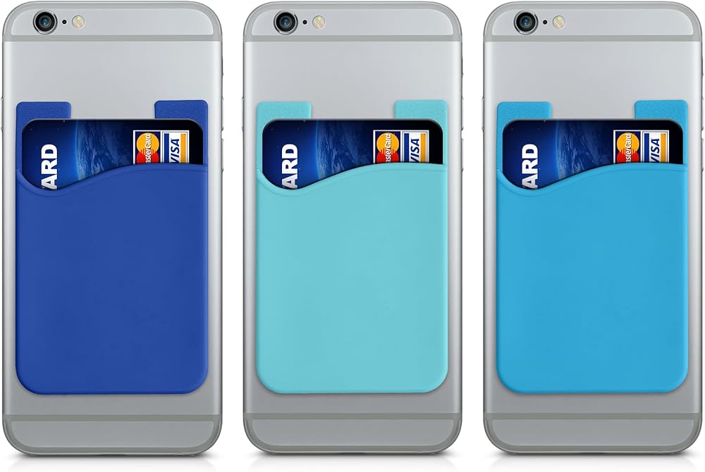 kwmobile Stick-On Card Holder for Phone (Set of 3) - Silicone Wallet Card Holders - Sticks on to Cell Phone Back or Case - Light Blue/Blue/Dark Blue