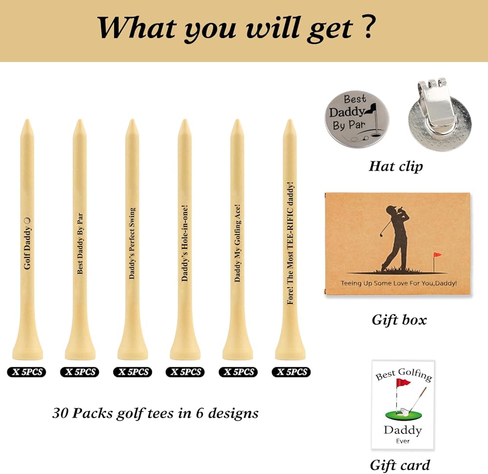 Golf gifts for dad - The set includes 30 golf tees with 6 different designs,1 hat clip and 1 card.Comes with a box and great for the dad who like golf.