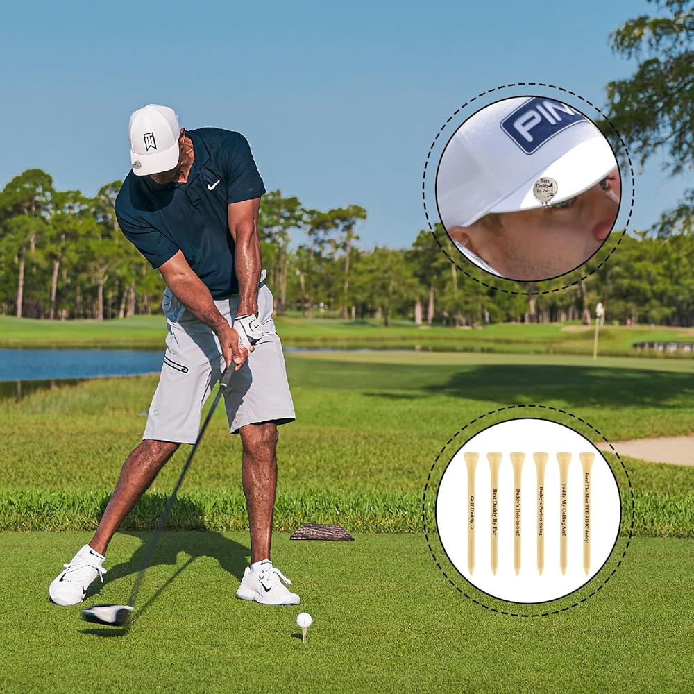 The golf tees feature punny sayings like “Best Dad By Par”,”Dad's Perfect Swing”,”Golf Dad“,”Dad's Hole-in-One!”,”Dad, My Golfing Ace!”,”Fore The Most TEE-RIFIC Dad ” that will bring a smile to dad's face.The hat clip feature the "Best Dad By Par" to remind dad of your love and appreciation for him.