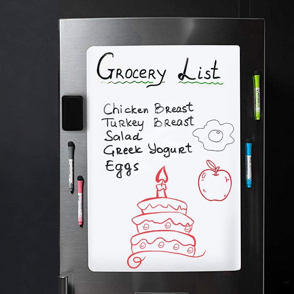 Multipurpose Magnetic White Board: can be used at home, office or schools. Write down GROCERY LIST - TO DO LIST - TO BUY LIST-CHORE LIST - SHOPPING LIST - DRAWING BOARD - OFFICE BOARD - DAILY MENU PLANNER - CALENDAR - SCHEDULER -NOTES and stick it on the fridge.