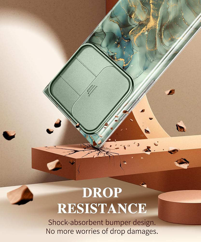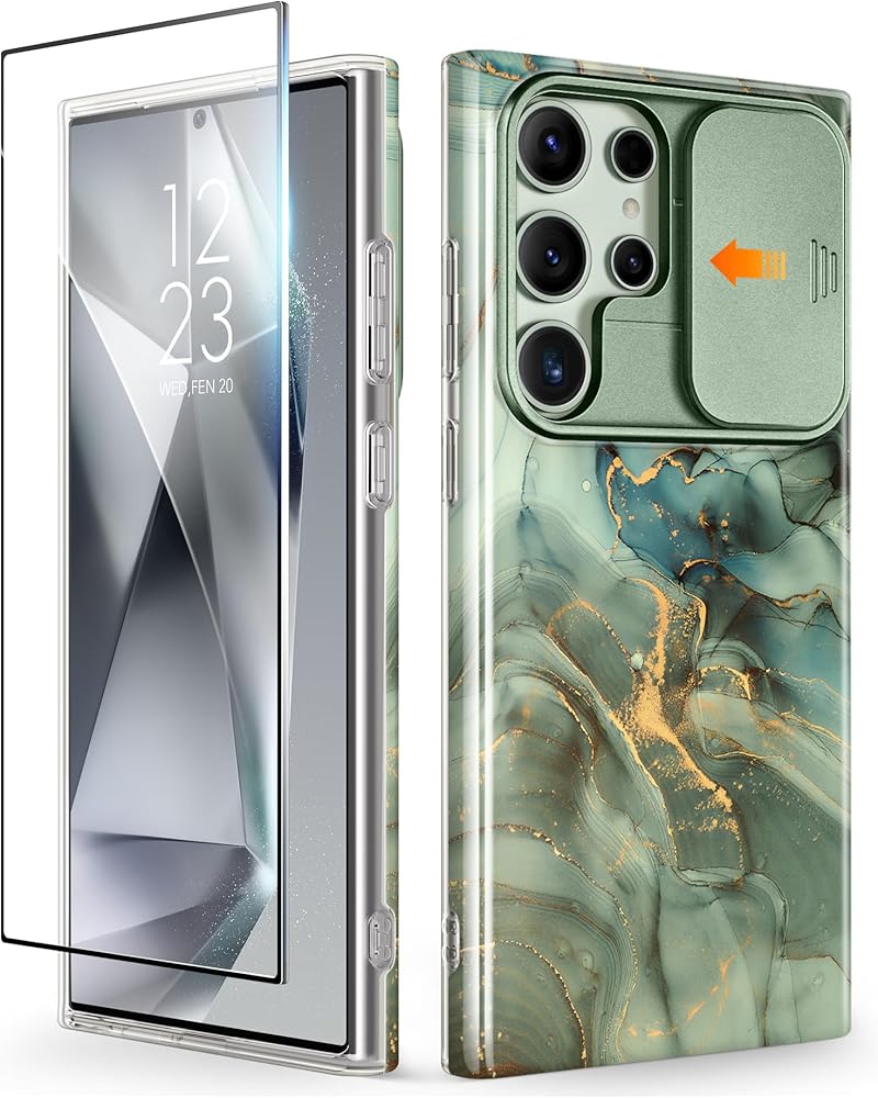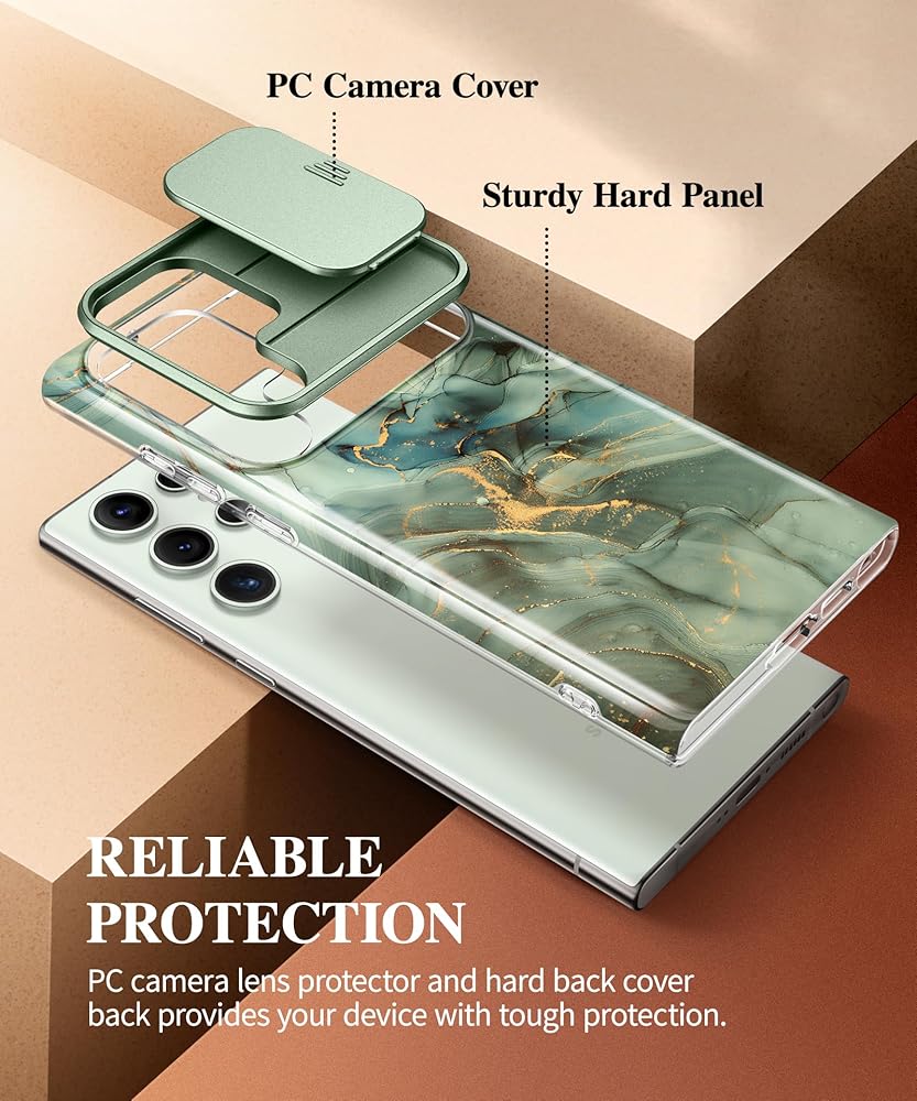 GVIEWIN for Samsung Galaxy S24 Ultra Case with Slide Camera Cover+Screen Protector, [Military Grade Shockproof] Marble Protective Slim & Tough Phone Case for S24 Ultra 6.8"(Desert Dream/Green)