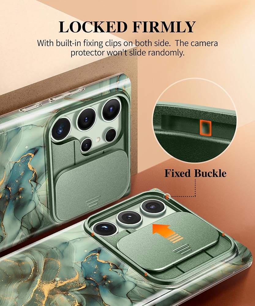 [Upgraded Anti-Scratch Sliding Camera Lens Protector] Sturdy sliding camera lens cover and 0.09 IN raised lip around the camera protect against scratches, collisions, and dust, providing "dual protection" for your phone and lens. The camera cover has a invisible buckle on both sides for added security, ensuring that the protective camera cover will not slide or loosen at will during use.