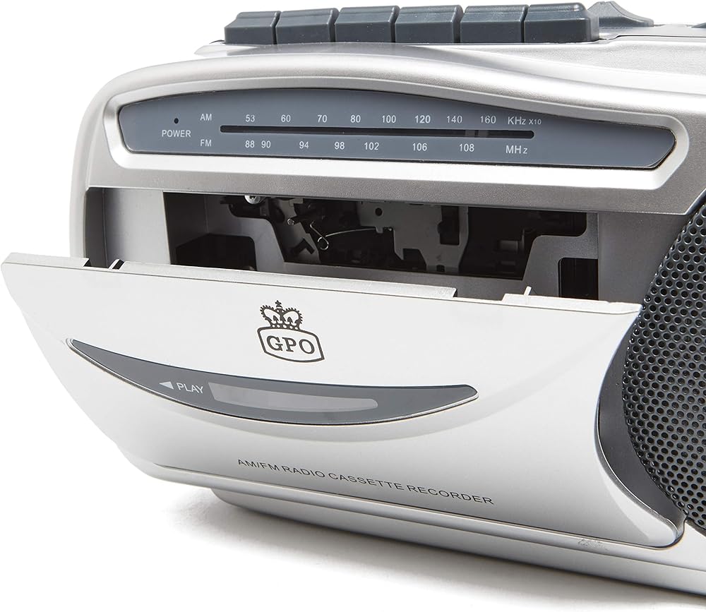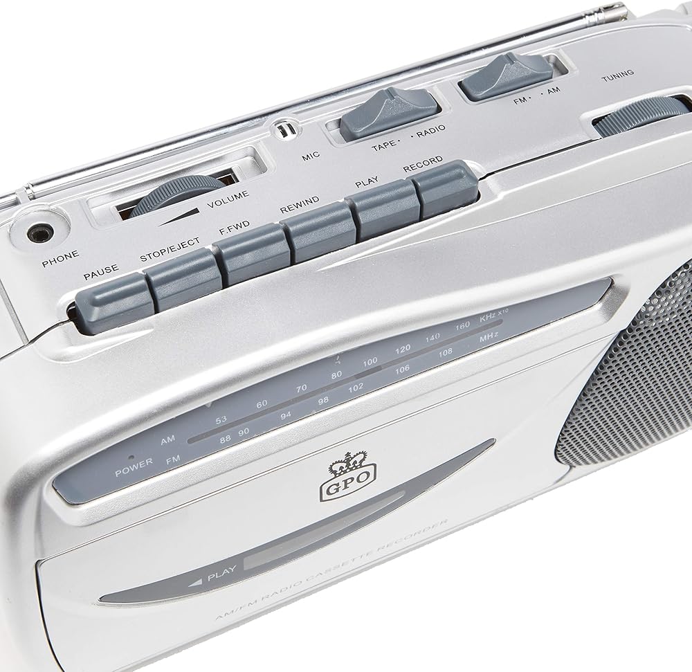 GPO 9401 Retro Portable AM/FM Radio and Cassette Player - Headphone, Microphone Sockets - Silver