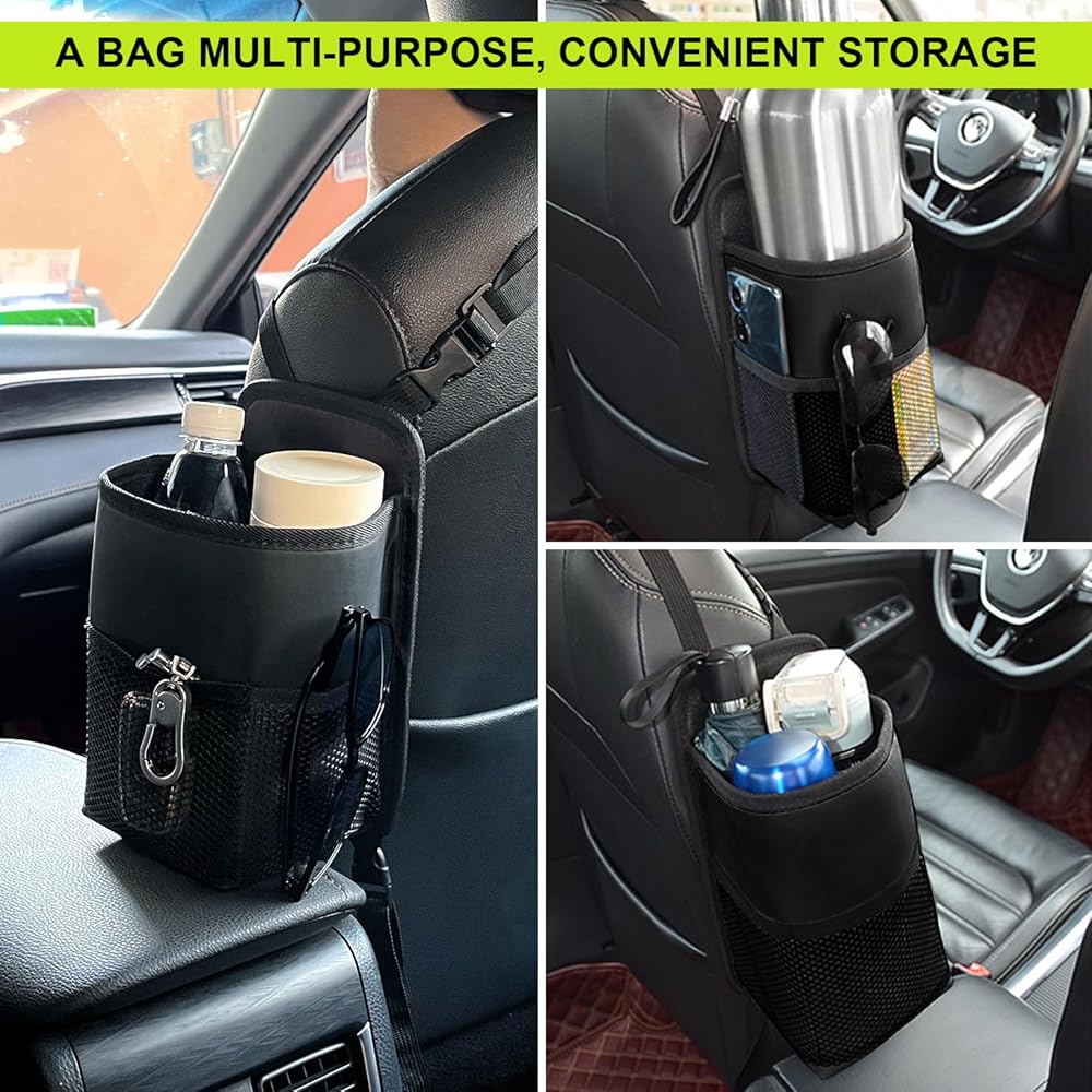 Universal Hanging Car Organizer - Extra Deep 12cm Cup Holder Bag with Locking Hook, Waterproof Leather & Mesh Pockets for Phones/Keys, Fits SUVs/Trucks (Black)