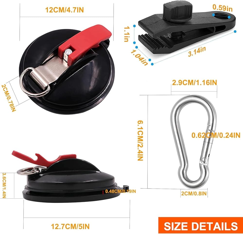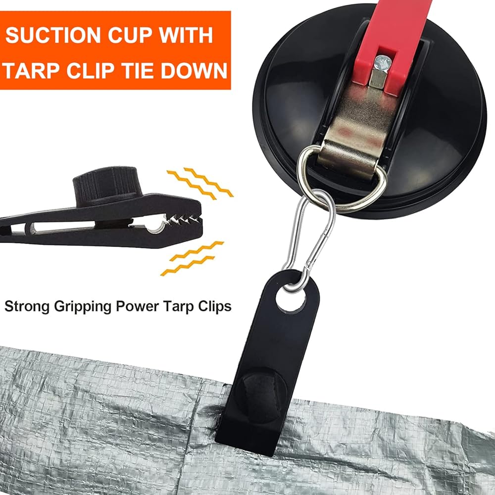 Upgrade Heavy Duty Vacuum Suction Cups Anchor,2pcs Strong Vacuum Suction Cups Tie Downs with 4 Carabiners & 2 Tarp Clips for Car Awning Boat Camping Trap