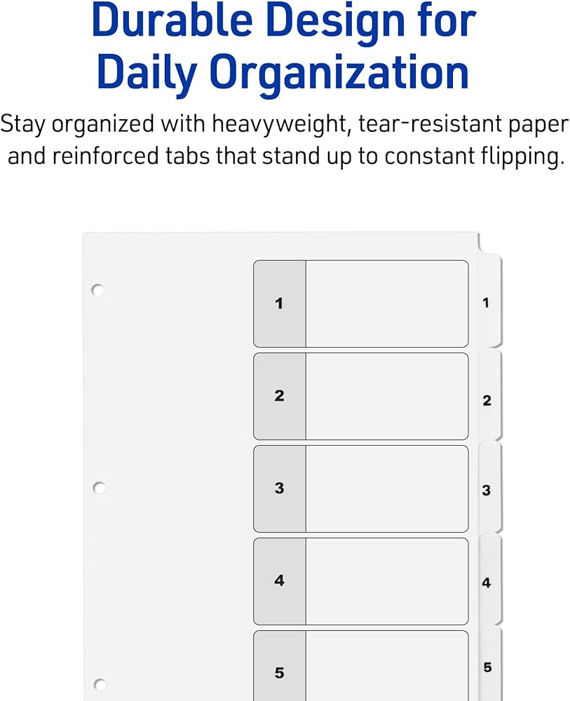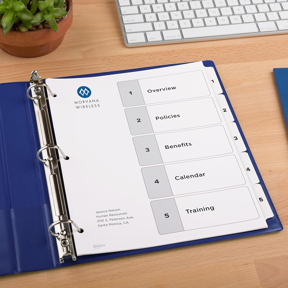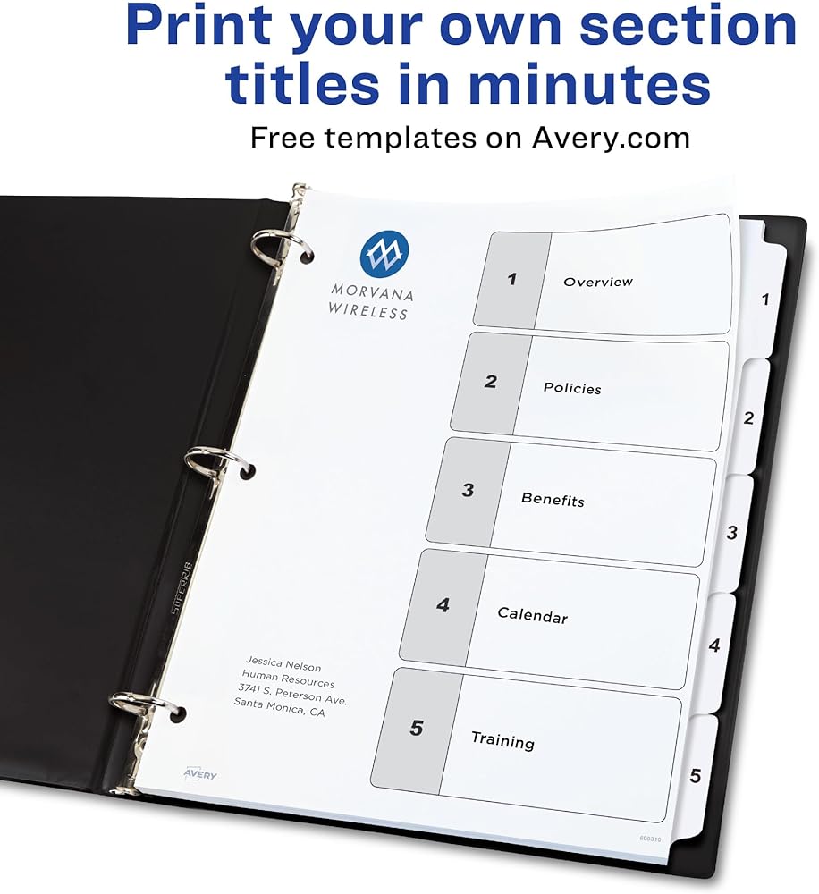 Organize your projects in seconds with the Avery Ready Index 5 Tab Dividers. Each white tab is preprinted to present a professional look. Print customized section titles and images onto the table of contents sheet without worrying about inserts or labels. Whether you're hosting a meeting or creating binders for classes, these dividers are perfect for getting things sorted. 1 set of 5 tabbed dividers are included with each sheet measuring 8-1/2”x11”. The 3 ring binder holes are reinforced on both sides of the heavyweight sheet to prevent tearing. Each tabbed divider also includes additional reinforcement along the edge of the sheet to distribute stress and resist creasing. The table of contents sheet is also compatible with both laser and inkjet printers. This sheet can be printed in either portrait or landscape so that projects can be organized in any orientation. Just flip the sheet over to view the other layout. Check out the free templates for these dividers and try out the Avery Design & Print software today on the Avery sites