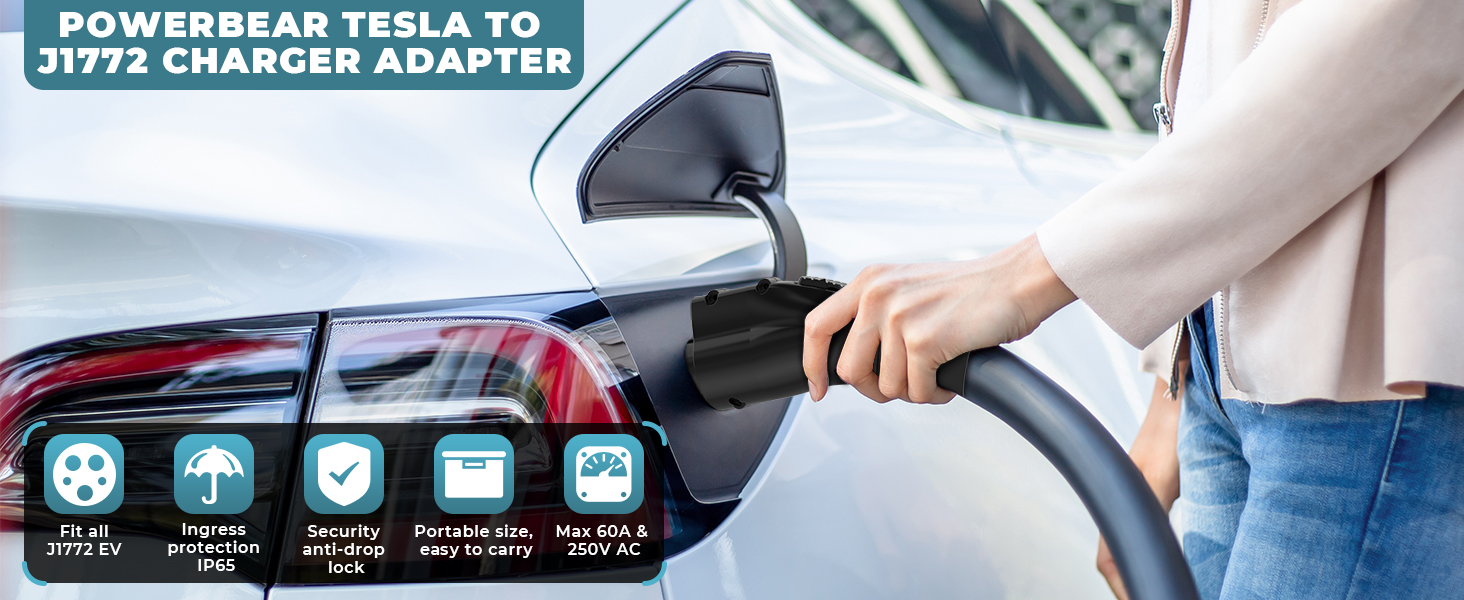 PowerBear Tesla to J1772 Adapter, Max 60A/250V AC, Tesla to J1772 Charging Adapter with Security Lock for J1772 EVs, Compatible with Tesla Wall Connector/Destination Chargers/Mobile Connectors