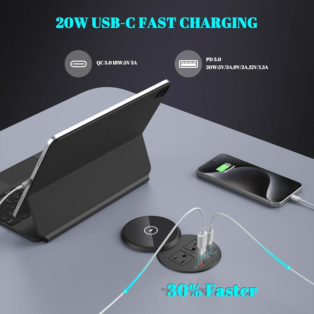 【Desktop Power Grommet】This power strip comes with fast charging PD 20W Max USB-C port,QC 3.0 18W Max USB-A port and 10W wireless charger. There is also 2 AC outlets for your home appliances. It will offer 4 smart devices charging which can facilitate your life and save you time. ALL power output:110-250V/10A/2500W.