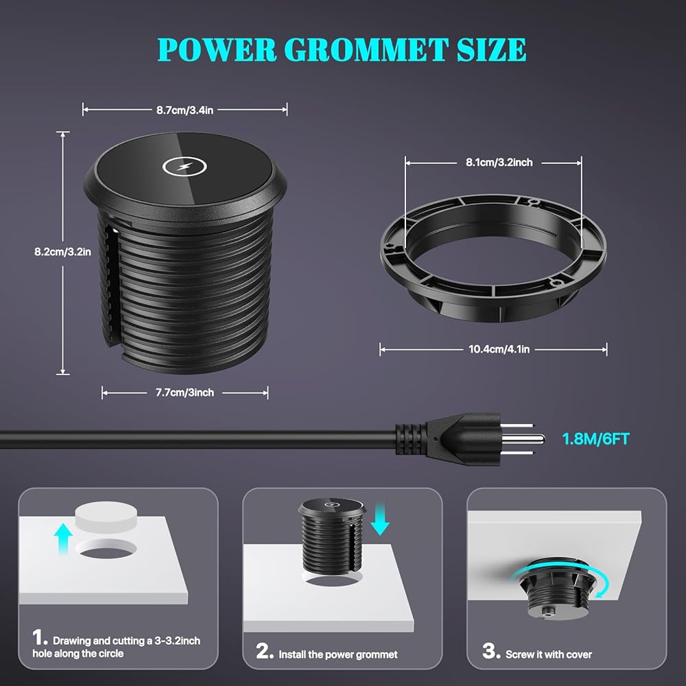【Easy to Install】This white power desk grommet fits a 3.1 inch hole size. Make a 8.1cm-8.6cm/3.2-3.3inch hole on the table surface or you can use the existing cable hole on your desk. The size of desk power strip is 8.7*8.2cm/3.4*3.2inch.
