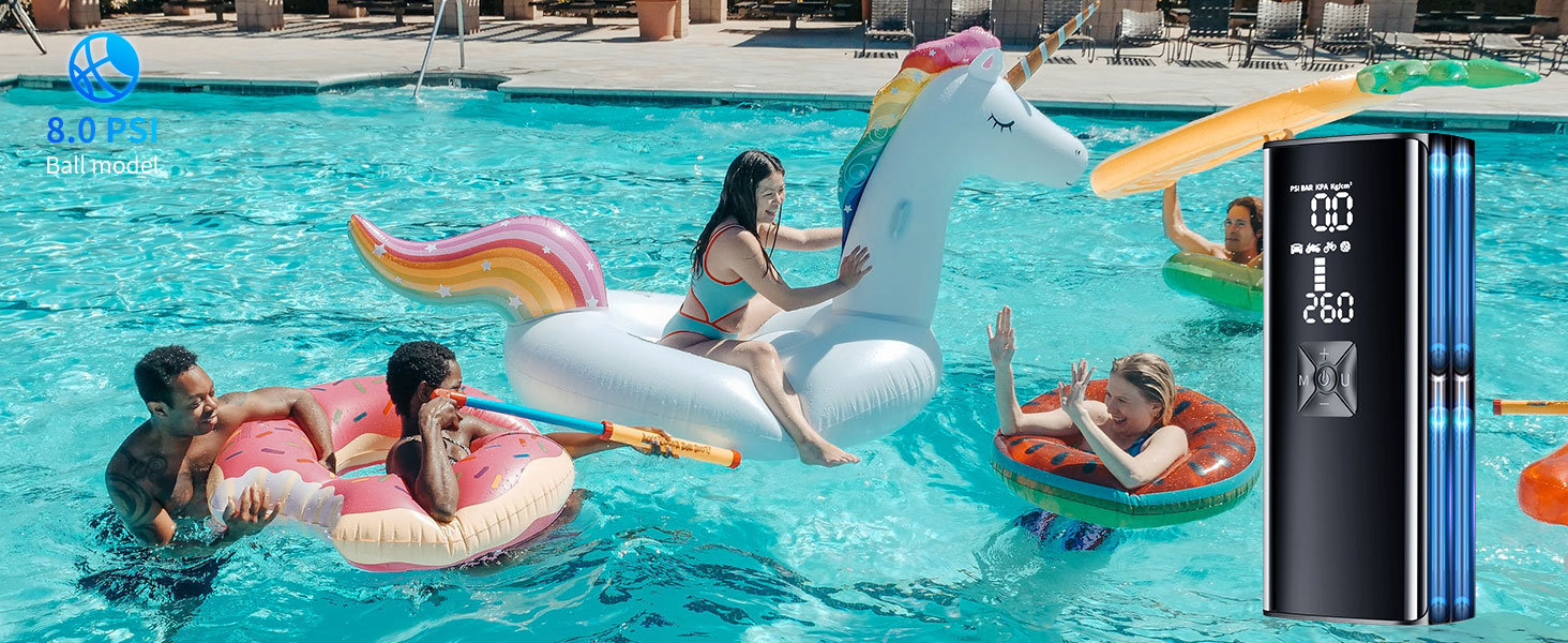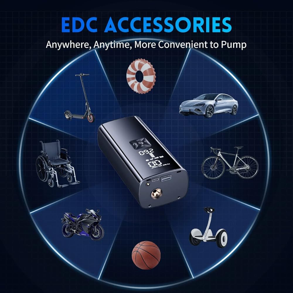 【4+N Smart Inflation Modes】The portable air compressor is designed with 4 preset inflation modes: cars, motorcycles, bicycles, and balls; it also has 4 preset pressure display units: PSI, BAR, KPA, Kg/cm², super easy to use, the tire inflator will automatically stop when the desired pressure is reached. Additionally, the manual mode allows you to set pressure values up to 150PSI and the tire inflator comes with multiple adapters, catering to your different inflation needs.