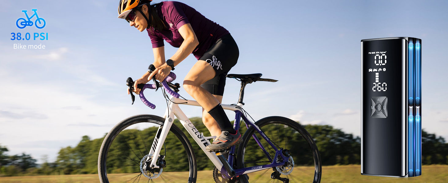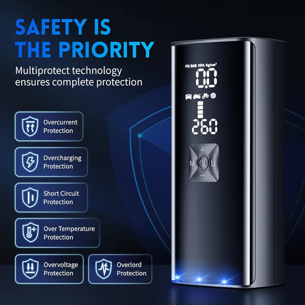 【Dual Screen Pressure Display】The smart air pump keeps a close eye on your tire pressure with the large dual LCD digital display, which shows real-time pressure and preset values for easy reading and monitoring. No more worries about over-inflating your tires. Stay safe on the road.