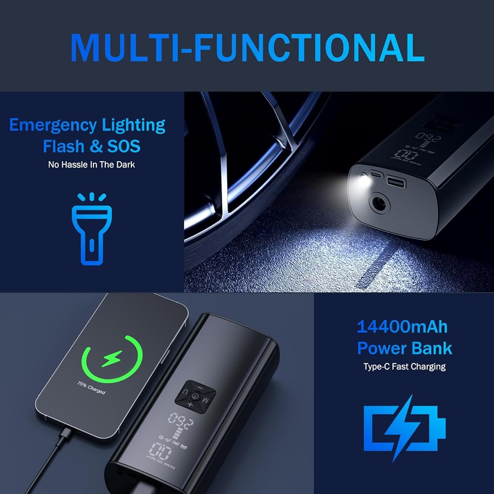 【Multi-Functional Air Compressor】The 3-in-1 air compressor tire inflator can also be used as emergency power bank for your cellphones and flashlight in the night. With its compact, lightweight and portable design, it also comes with a convenient storage bag for home and on-the-go use. It can be a great gift for your family and friends.