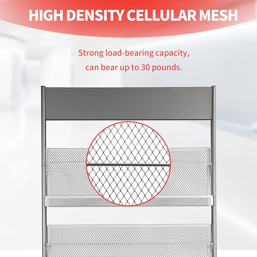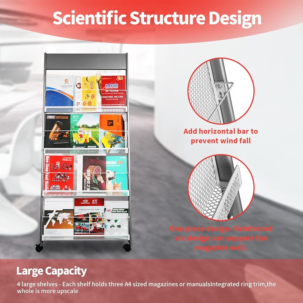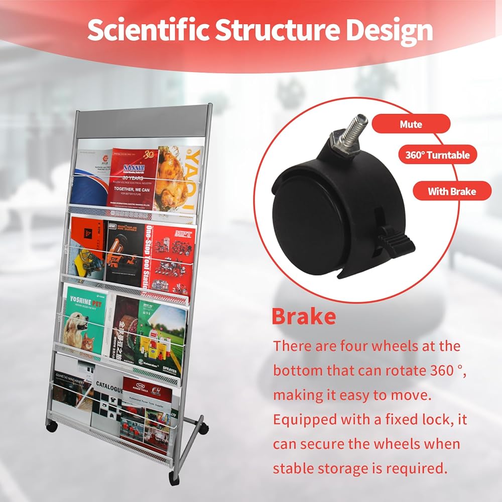 Scientific Structural Design: Umisu magazine rack is designed with steel mesh, which can promote air circulation and effectively reduce dust accumulation. At the same time, our magazine rack is equipped with 4 universal brake wheels, you can rotate 360 degrees, and move in any direction without restriction. Each wheel has an independent brake device, which can be placed stably without slipping.